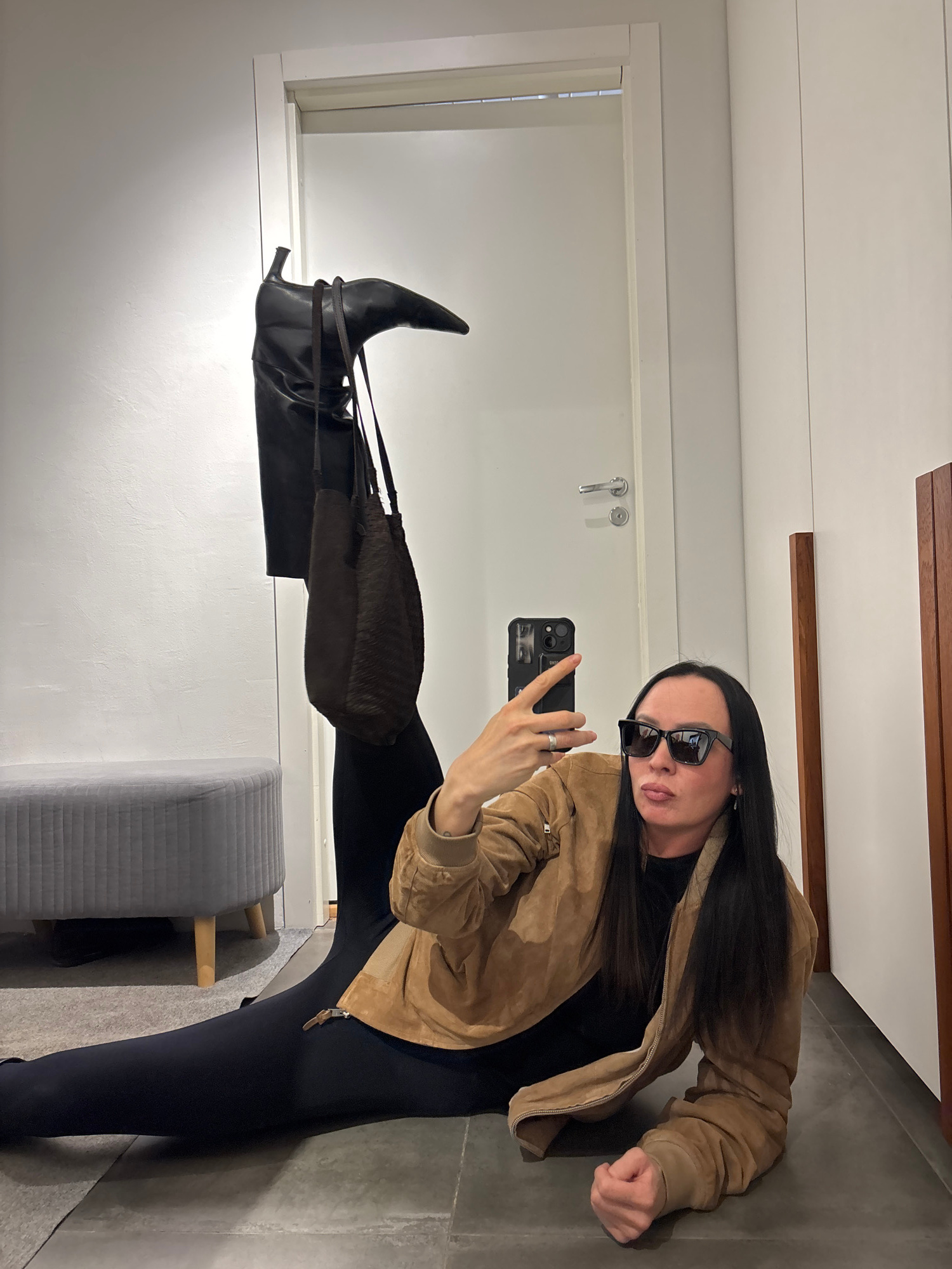 A woman takes a selfie in a fitting room. The woman is wearing sunglasses, a tan jacket, and black leggings. She is holding her leg up with a black knee-high boot and a brown purse on it. The backgrou…read more
