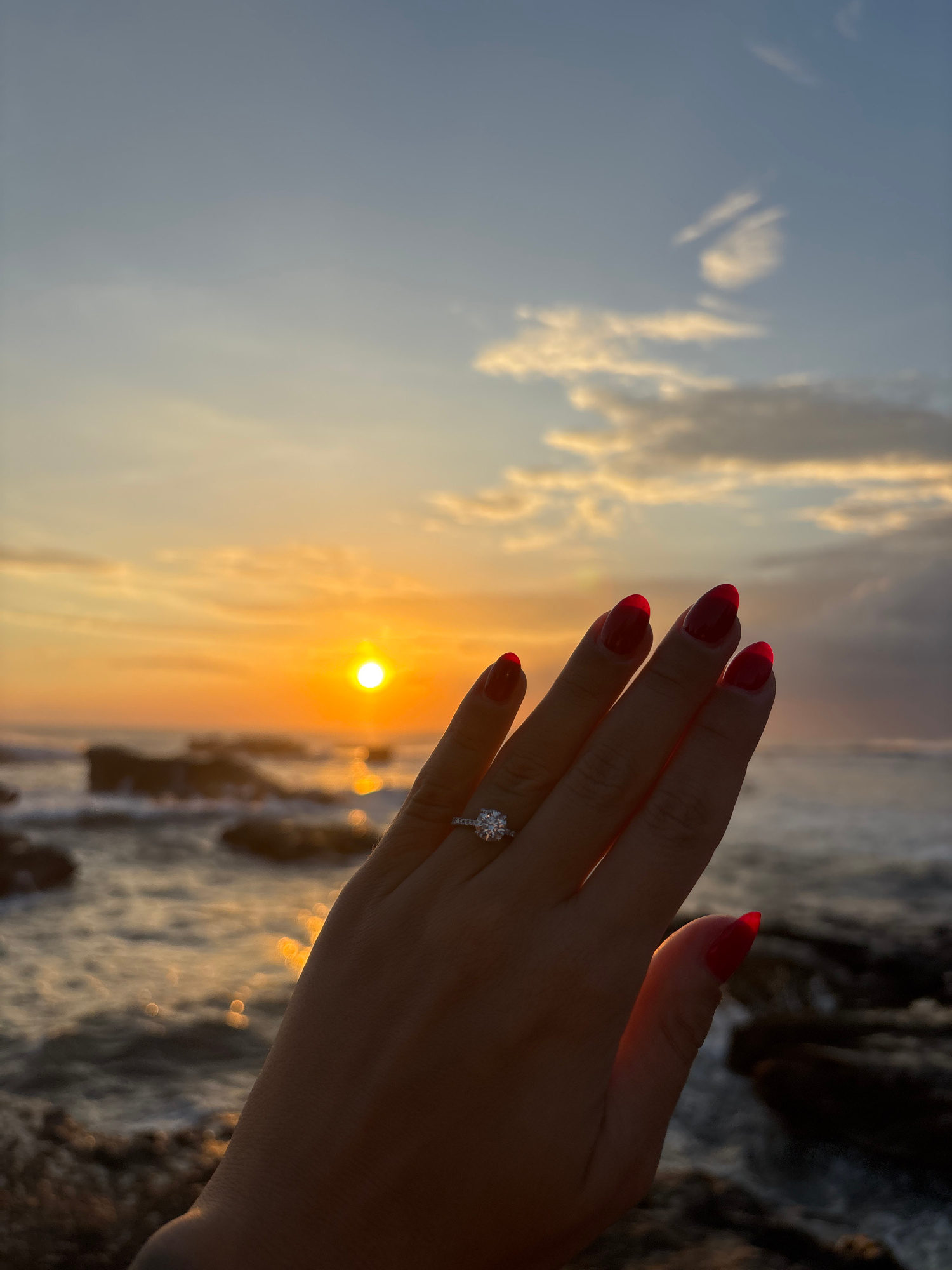 A person's hand with red manicured nails and a diamond ring is in the foreground of a vertical, eye-level photograph. The hand is angled, with the ring on the ring finger. The background shows a sunse…read more