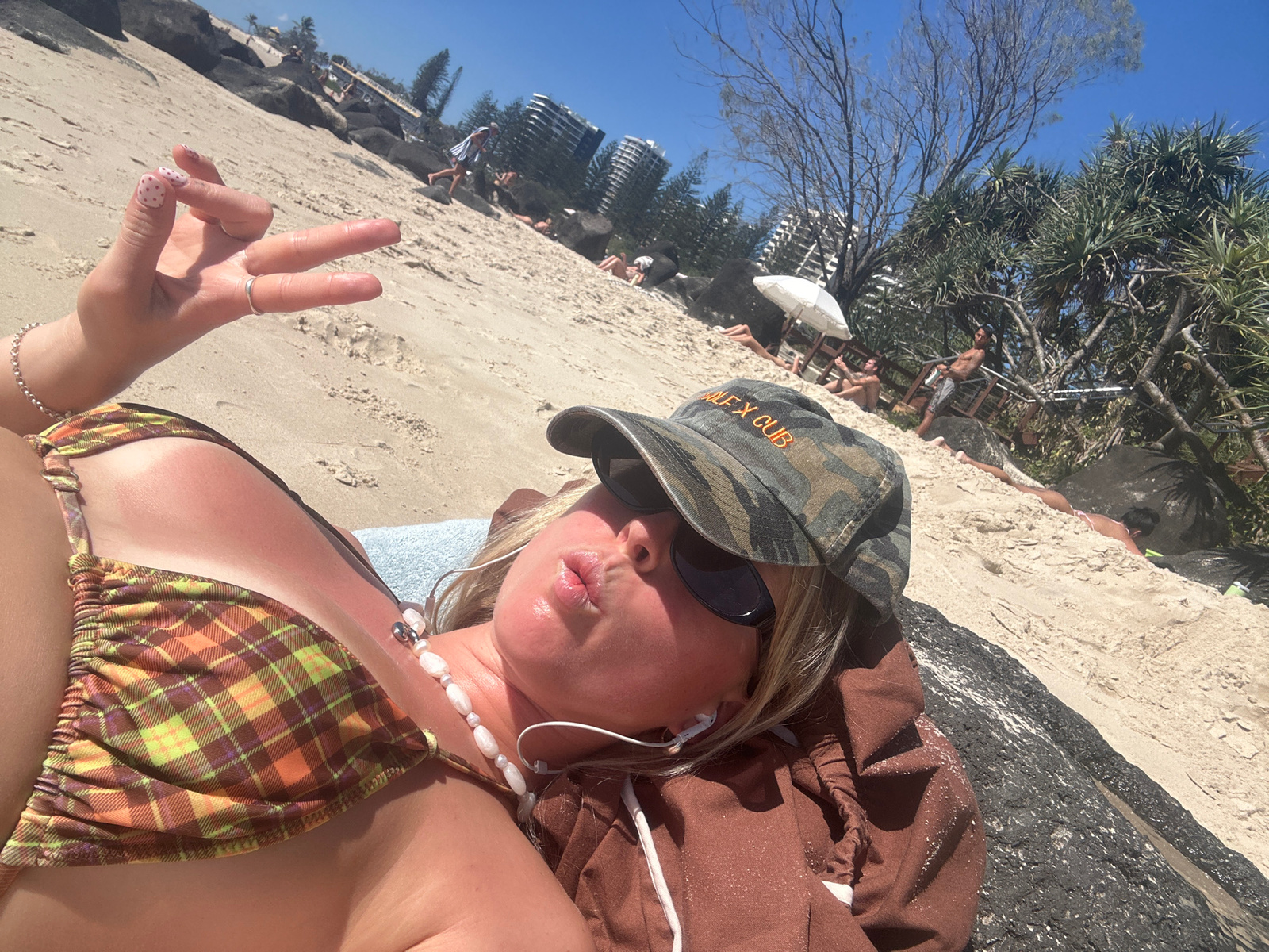 The image is of a woman lying on the beach in Coolangatta, Australia, wearing a bikini and a baseball cap. She is lying on her back with her head near a paved area that separates the beach from the stβ¦read more