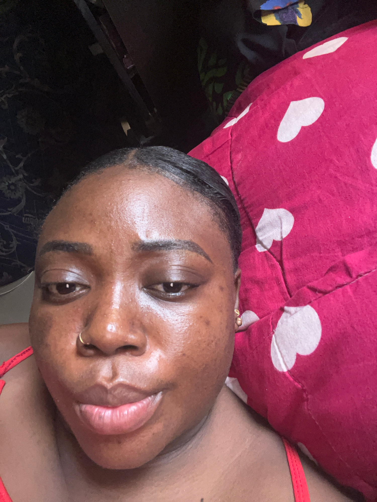 A close-up photograph depicts a dark-skinned person with a gold nose ring and gold earrings lying down. The person is resting their head on a red pillow with white heart patterns. The background is da…read more