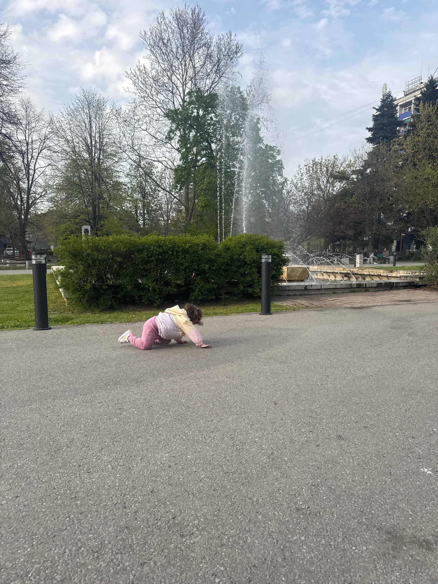 A child in a yellow/white jacket and pink pants is sprawled on a gray asphalt surface. Behind the child, there's a green hedge and a lamppost. In the background, there's a fountain spraying water into…read more