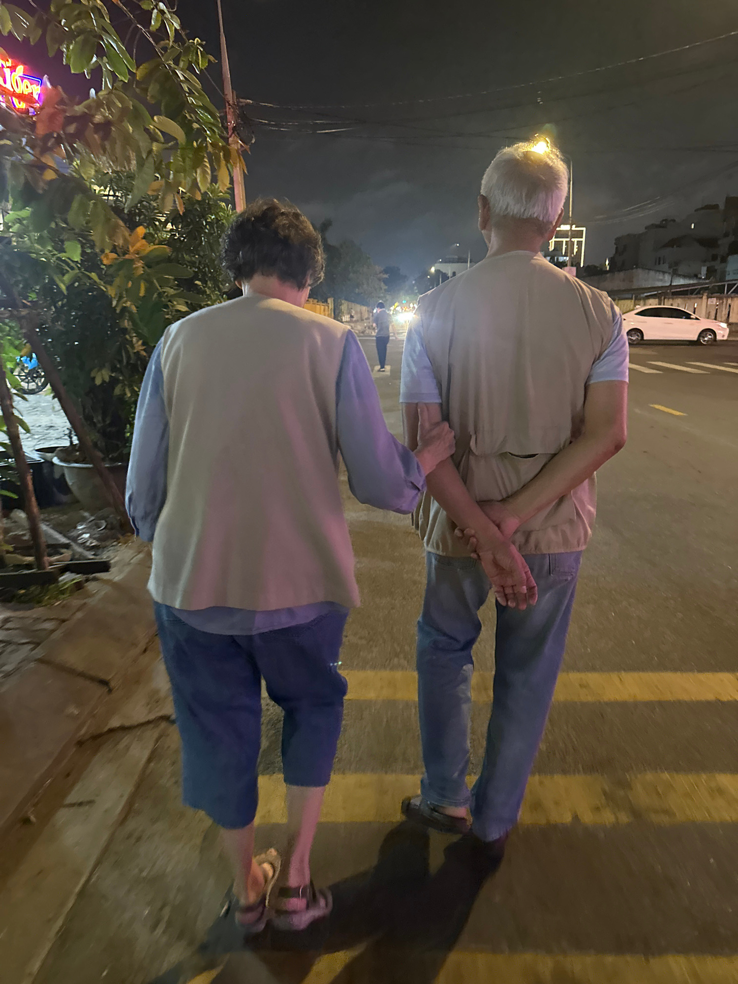 Two people are standing on a sidewalk in a brightly lit area of Đà Nẵng, Vietnam. Both are wearing casual clothing, including tan vests and blue shirts. One person is wearing jeans and dark shoes. The…read more