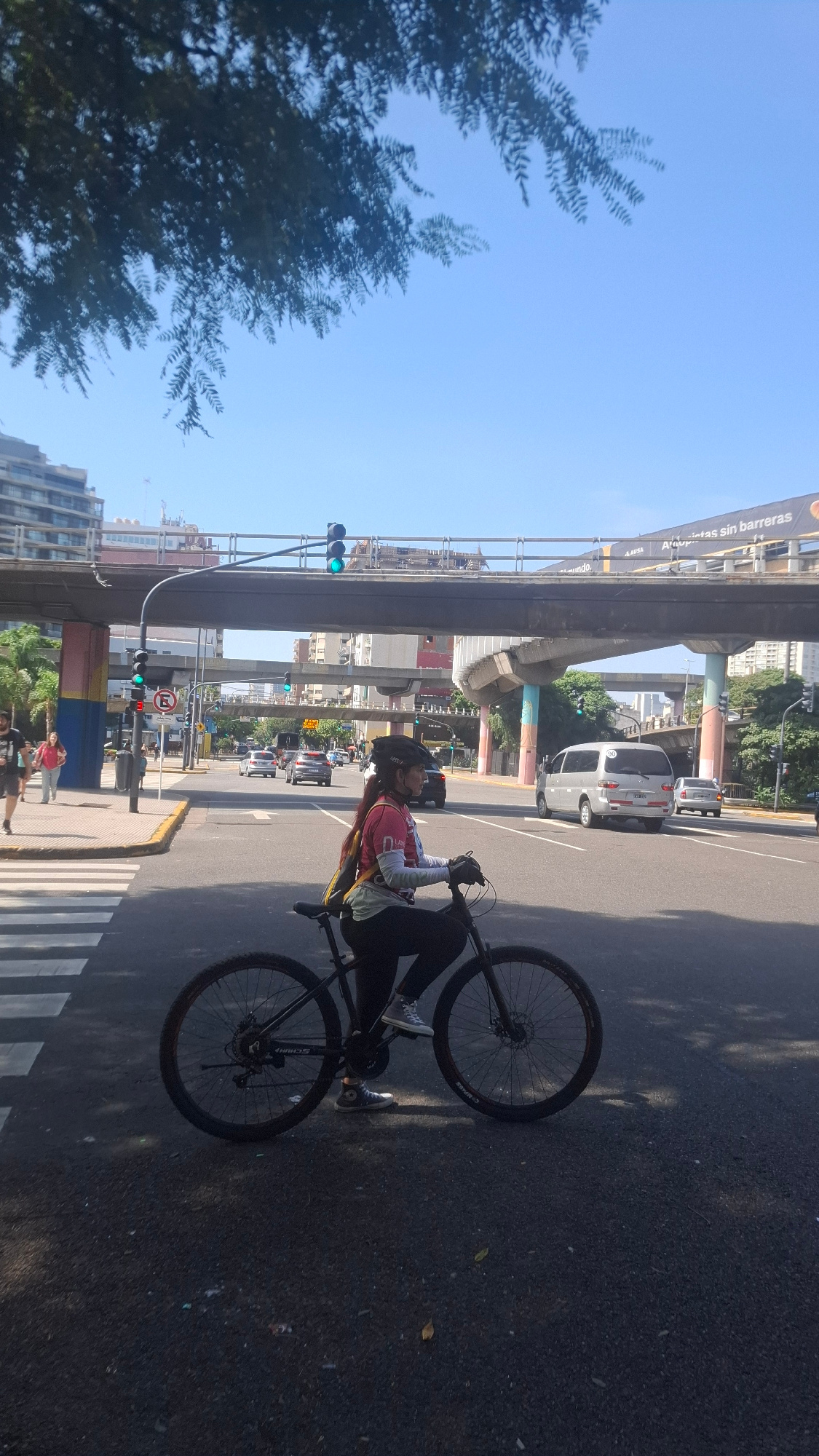 A cyclist is riding a bicycle on a city street in Buenos Aires, Argentina. The cyclist is wearing a helmet, gloves, and a cycling jersey, and riding on the right side of the road. Overhead, there is a…read more