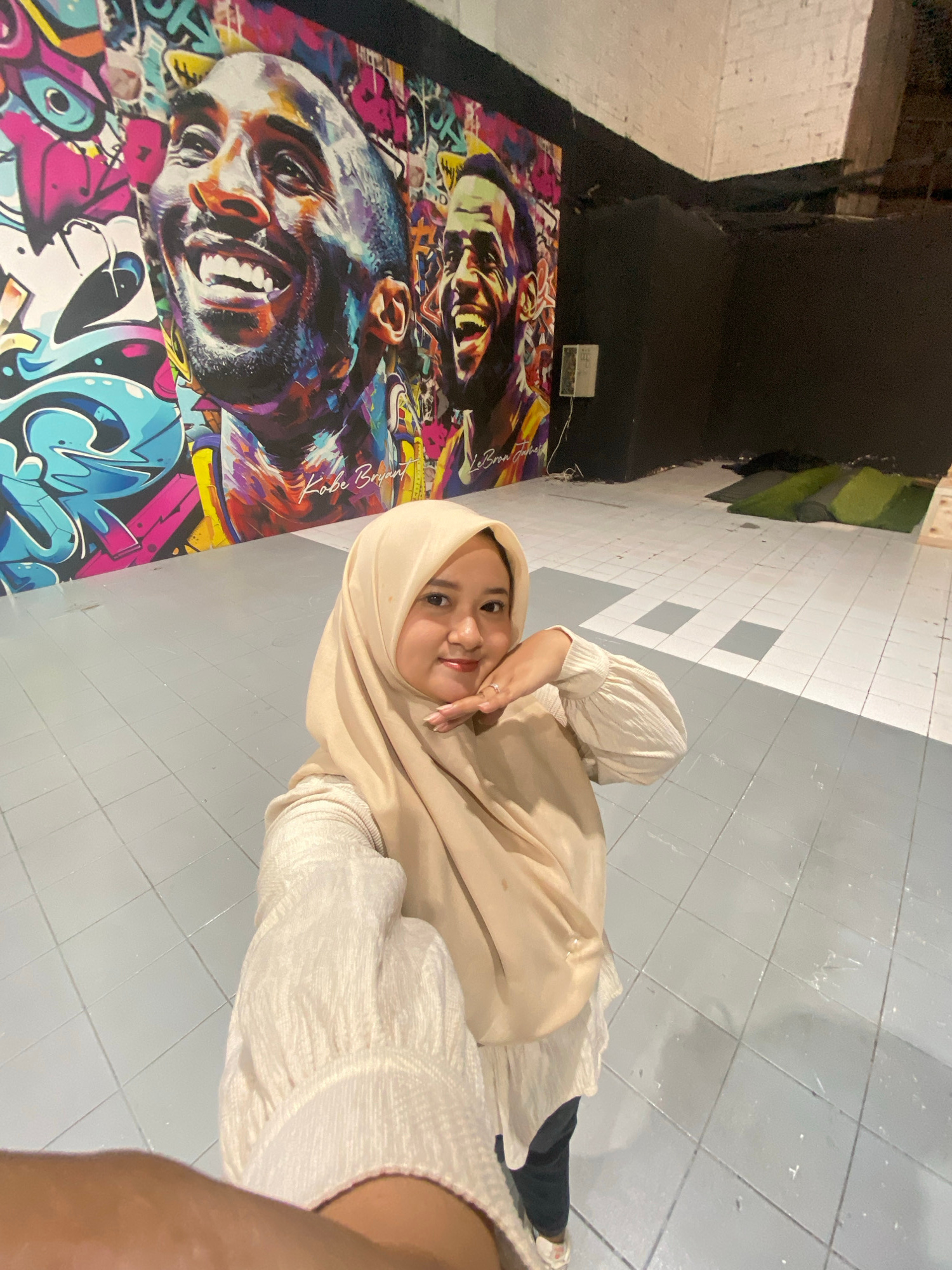 A woman wearing a beige hijab and a white textured top is posing for a photo in front of a mural depicting Kobe Bryant in a graffiti-style design. The mural is on a wall next to a tiled walkway in Sid…read more