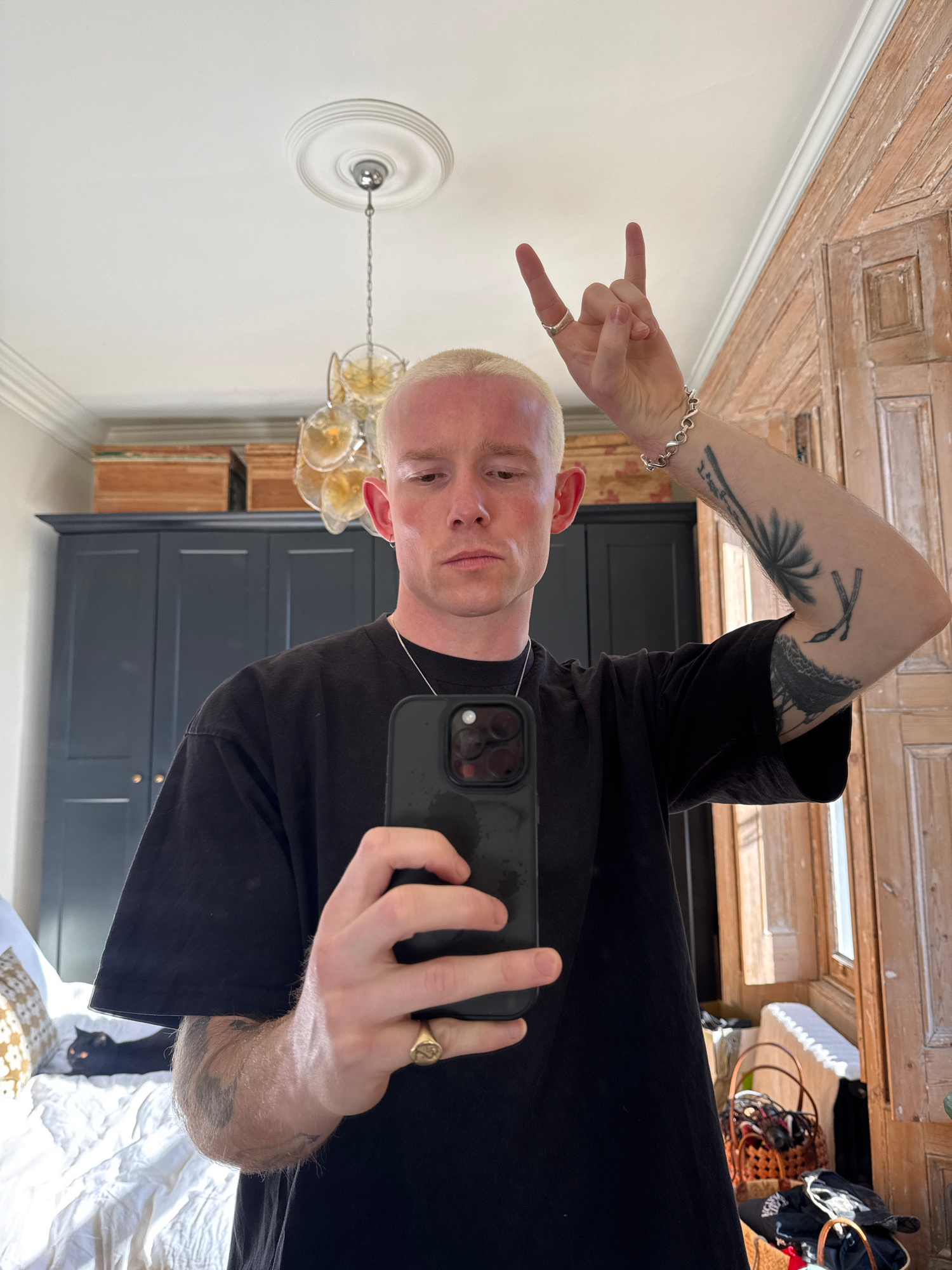 A person with short, bleached blond hair is taking a selfie in a room. The individual is wearing a black t-shirt and has multiple tattoos on their arms and hands, including a palm tree and abstract de…read more