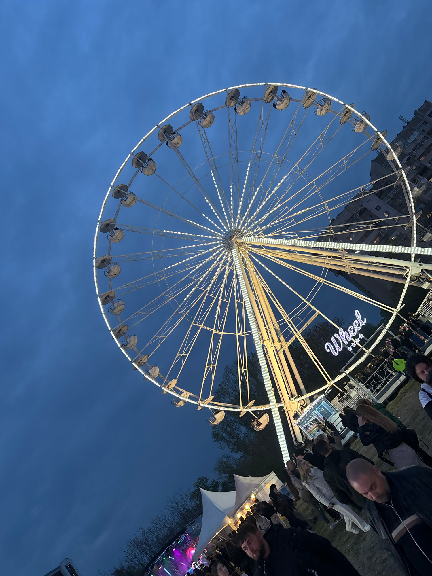The image captures an outdoor evening scene at what appears to be a fairground or public event in Plovdiv, Bulgaria. A large, brightly illuminated Ferris wheel dominates the left side of the frame, to…read more