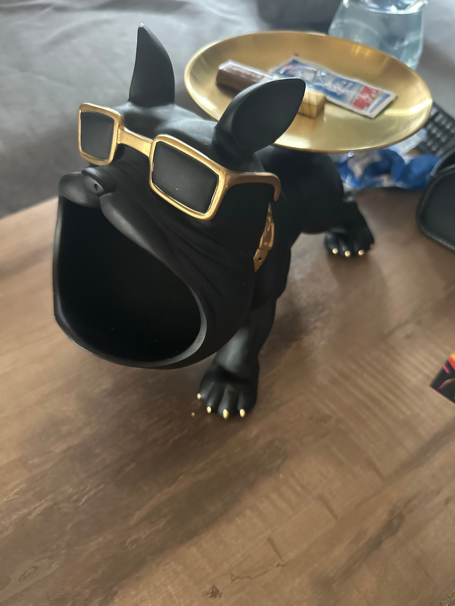 The image shows a black dog sculpture wearing gold sunglasses on a wooden floor. The dog is lying down, with its head facing the viewer. To the left of the sculpture, there is a gold tray with playing…read more