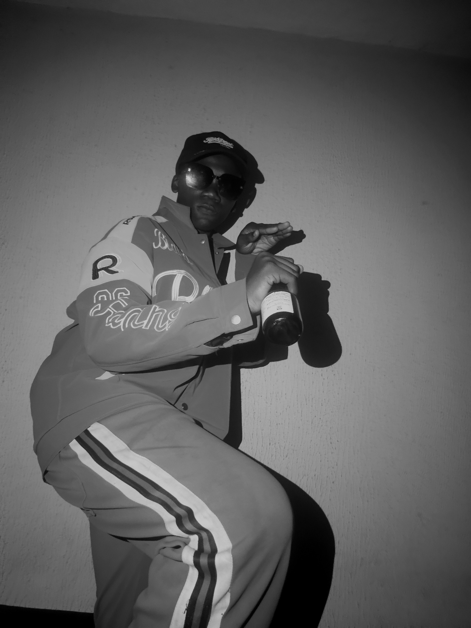 A low-angle, black and white photograph captures a dark-skinned person in a casual, relaxed pose, appearing to lean or lie against a textured, light-colored wall. The individual wears a black baseball…read more