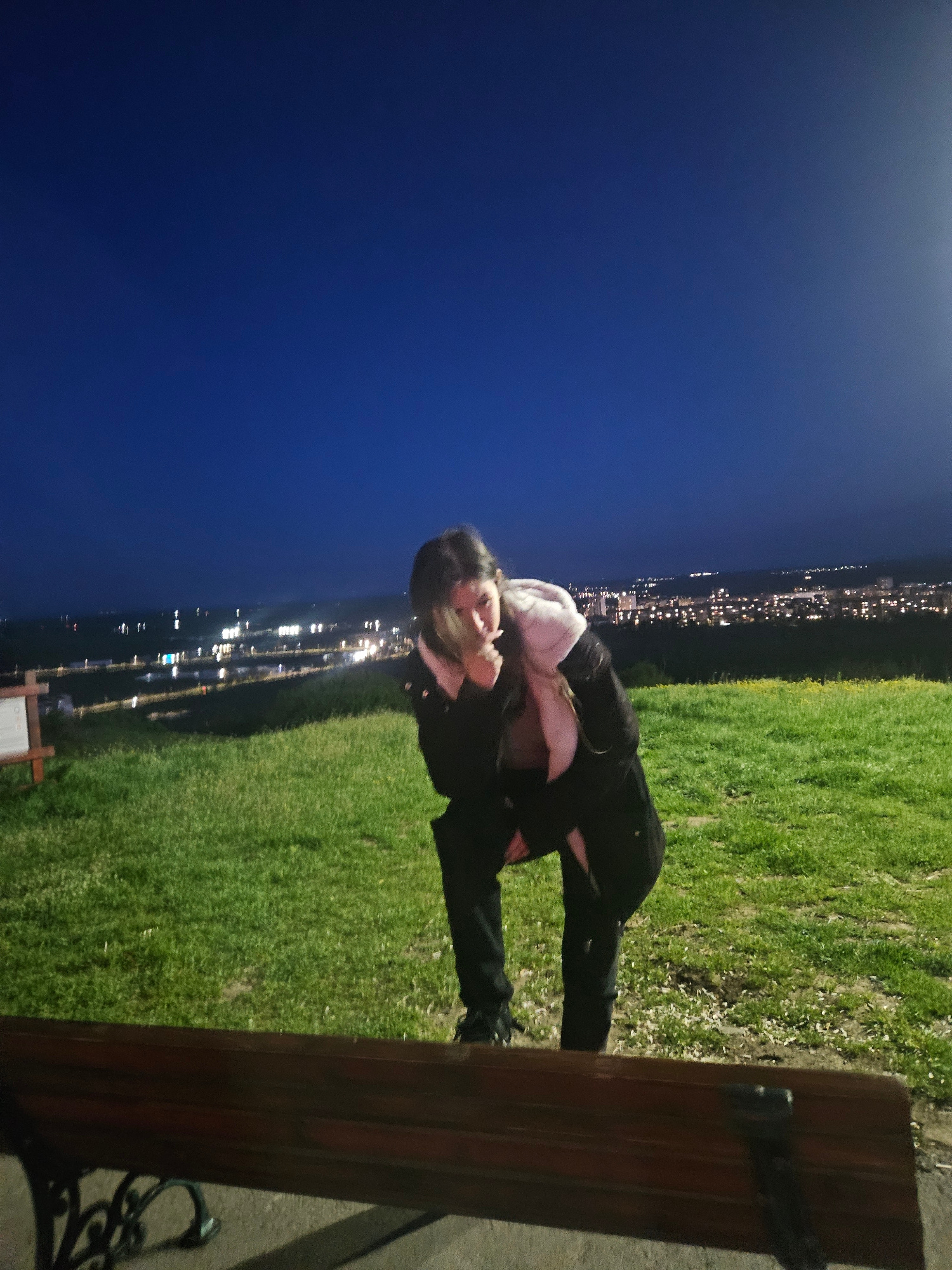 A woman stands on a grassy hill, leaning on a park bench, at night in Yambol, Bulgaria. The Yambol cityscape is visible in the background. The woman wears a dark coat and a light-colored hooded garmen…read more