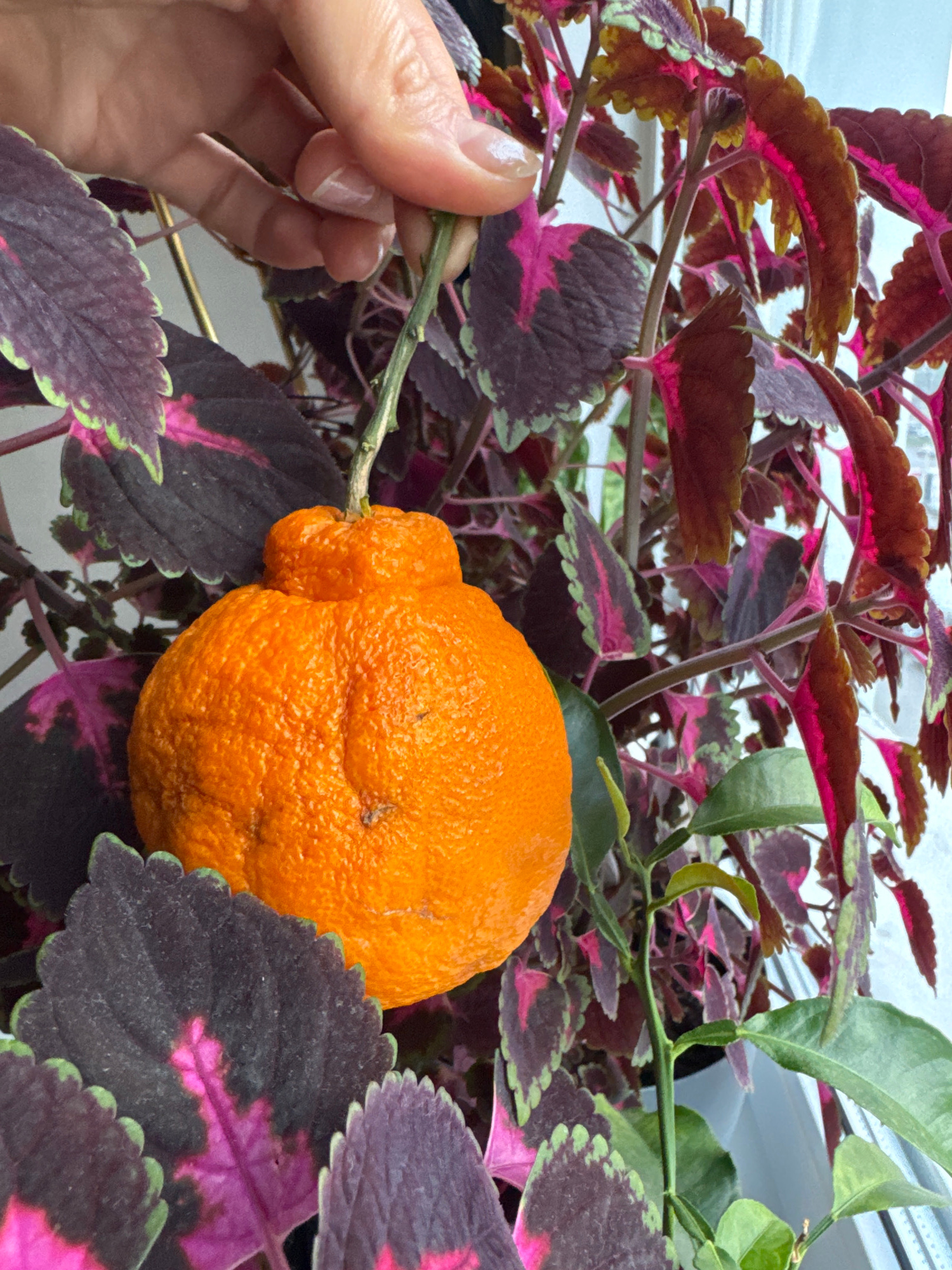 A close-up indoor shot depicts a textured orange citrus fruit, nestled within the foliage of a Coleus plant with variegated leaves of purple, green, and brown. A person's hand gently holds a stem of t…read more