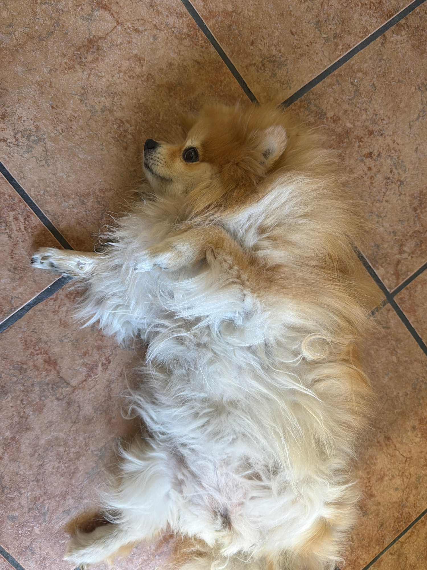 A tan and white Pomeranian dog lies on a light brown tiled floor with dark brown grout lines, its head oriented to the left of the frame. The dog's body is primarily white, while its head and portions…read more