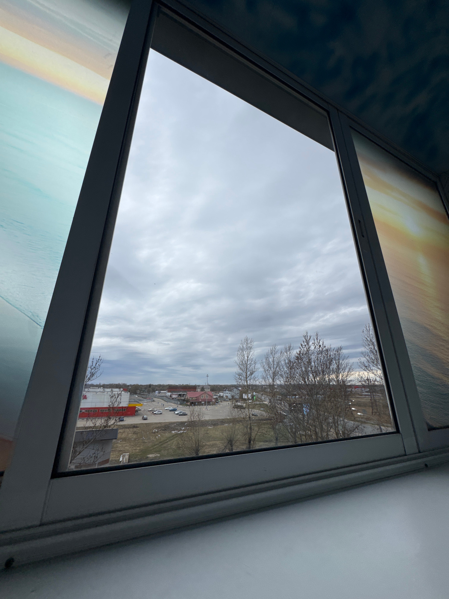 A view through a window. The window frame is grey and the glass pane shows a cloudy sky above a commercial area in Kladovitsy, Russia. A parking lot contains many cars and there is a large building wi…read more
