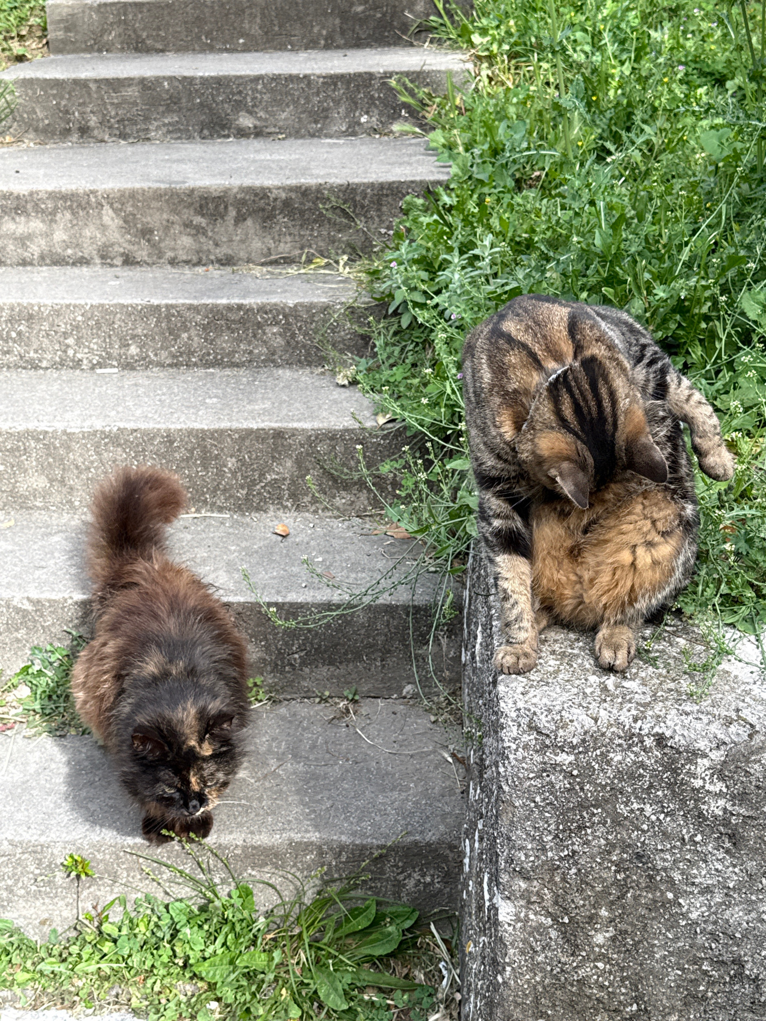 A top-down shot shows two cats near a concrete stairway. One cat, a tabby with brown and black markings, is curled on a grassy patch beside the top of the stairs. The second cat, with a mix of brown a…read more