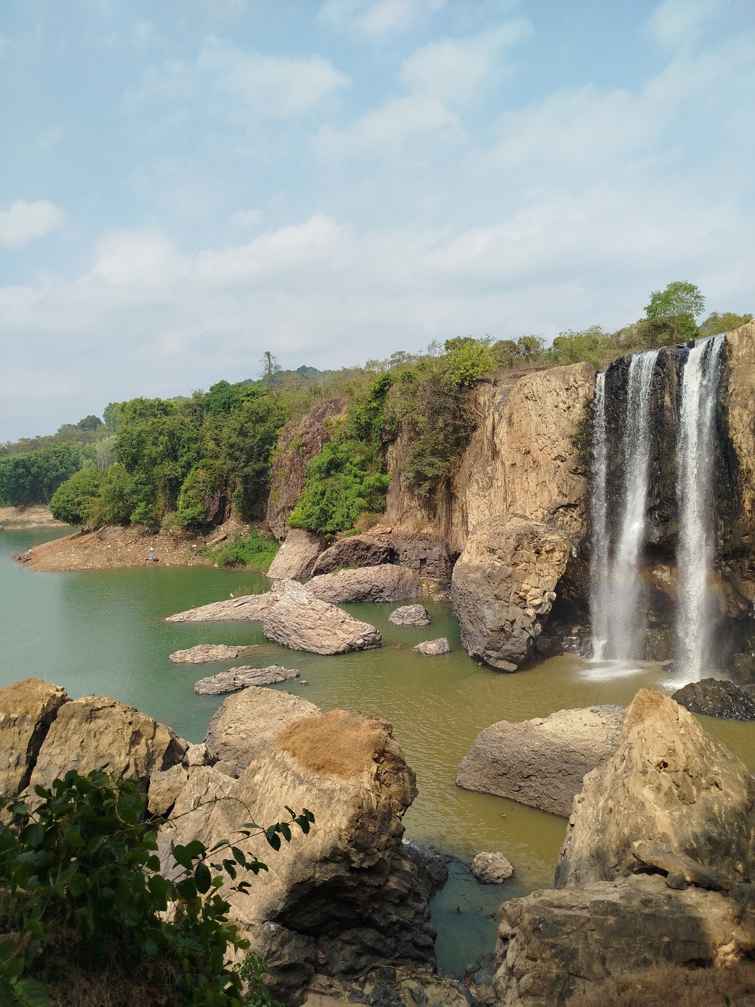 The image depicts a scenic waterfall in Đà Giang, Vietnam. Two distinct streams of water plunge over a rocky cliff into a pool below. A small rainbow is visible at the base of the waterfall. The water…read more