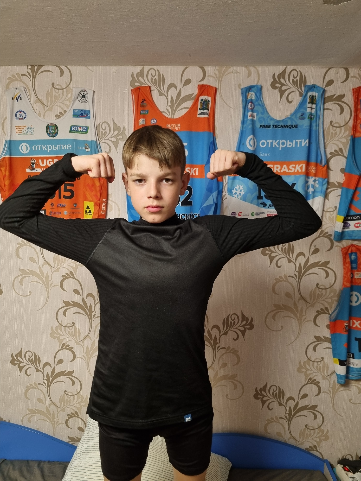 A boy is posing in front of a wall covered in patterned wallpaper. He is wearing a black long-sleeved shirt and black shorts. He is flexing both arms, creating a "muscle man" pose. Behind him, attache…read more