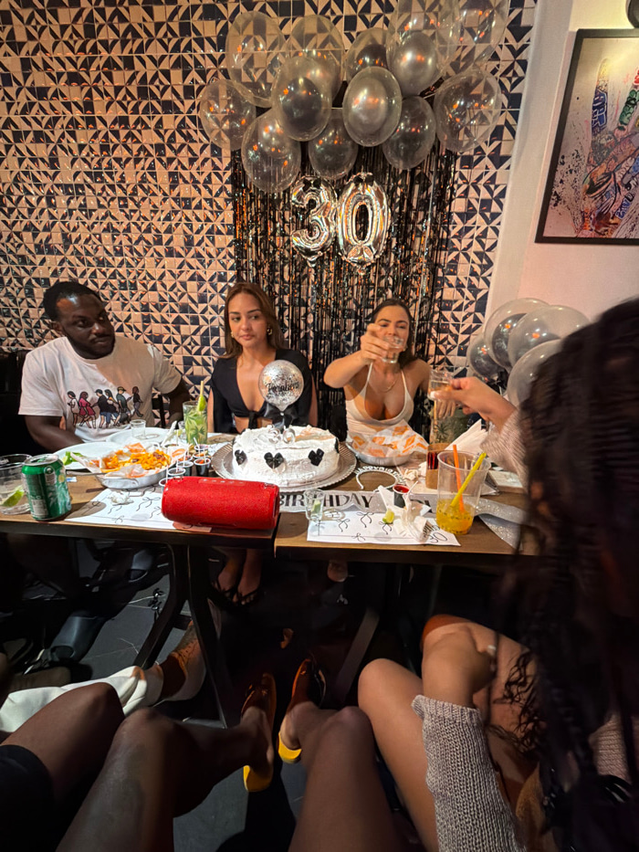 The scene depicts an indoor 30th birthday celebration at a restaurant or bar in Rio de Janeiro, Brazil. The establishment features walls covered in intricate blue and white geometric Azulejo tiles and…read more