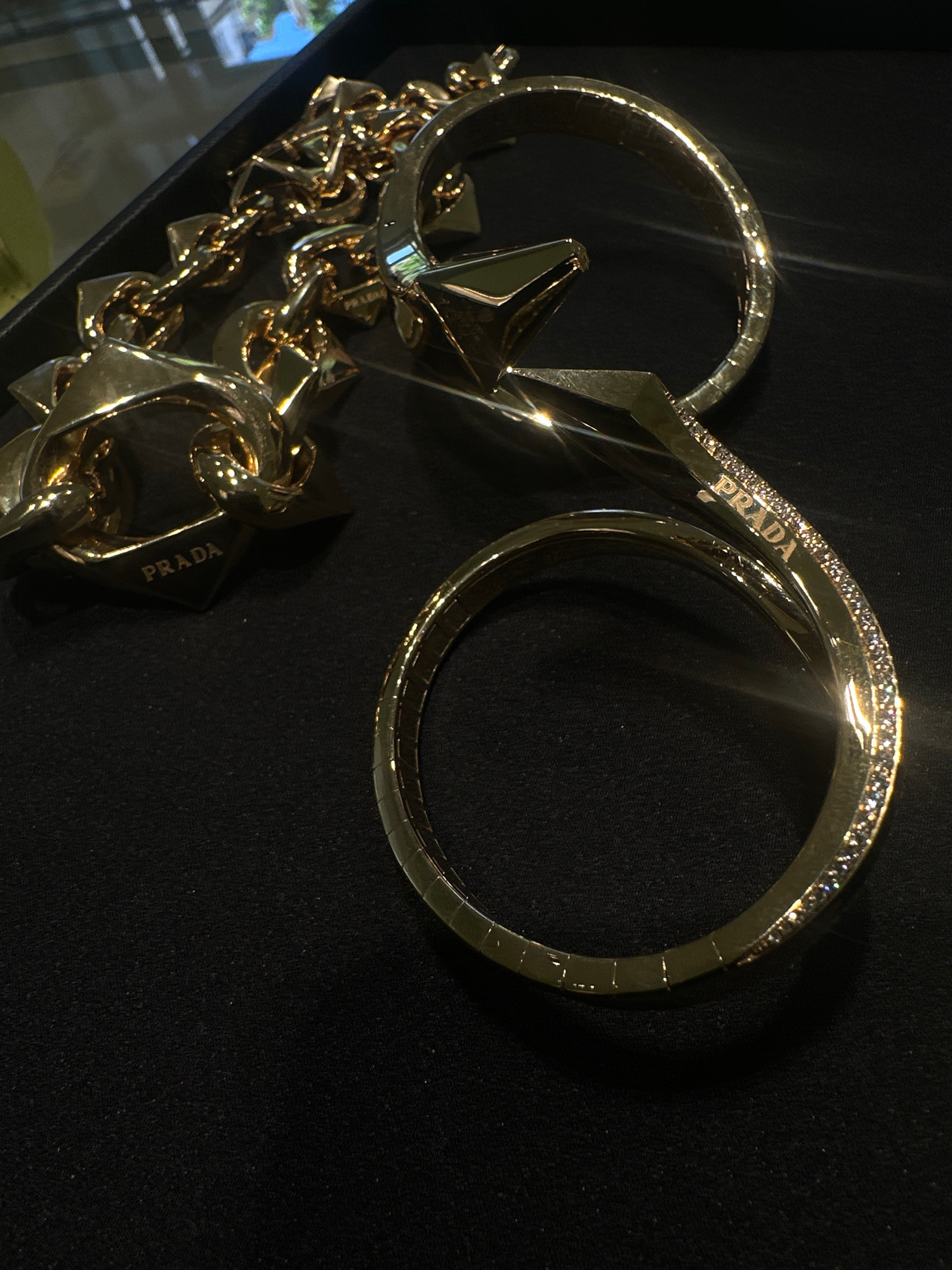 The image presents a close-up view of gold-colored jewelry displayed on a dark, possibly black, fabric surface. The primary subjects are a sparkling bangle and a substantial chain-link accessory, both…read more
