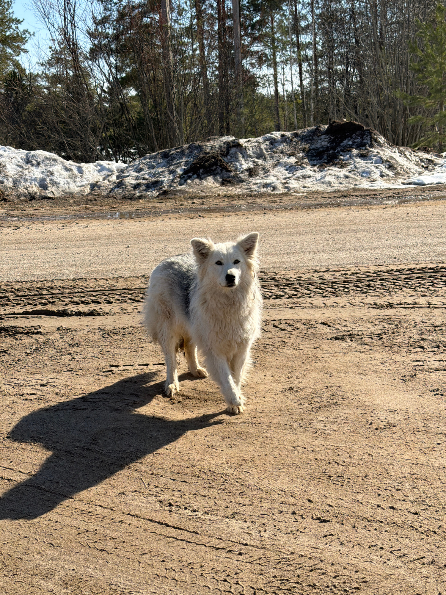 A medium-sized, fluffy white dog stands on a dirt and sand path in Noviy, Russia. The dog is casting a long shadow to its right and is looking toward the viewer. To the left of the path is a bank of m…read more