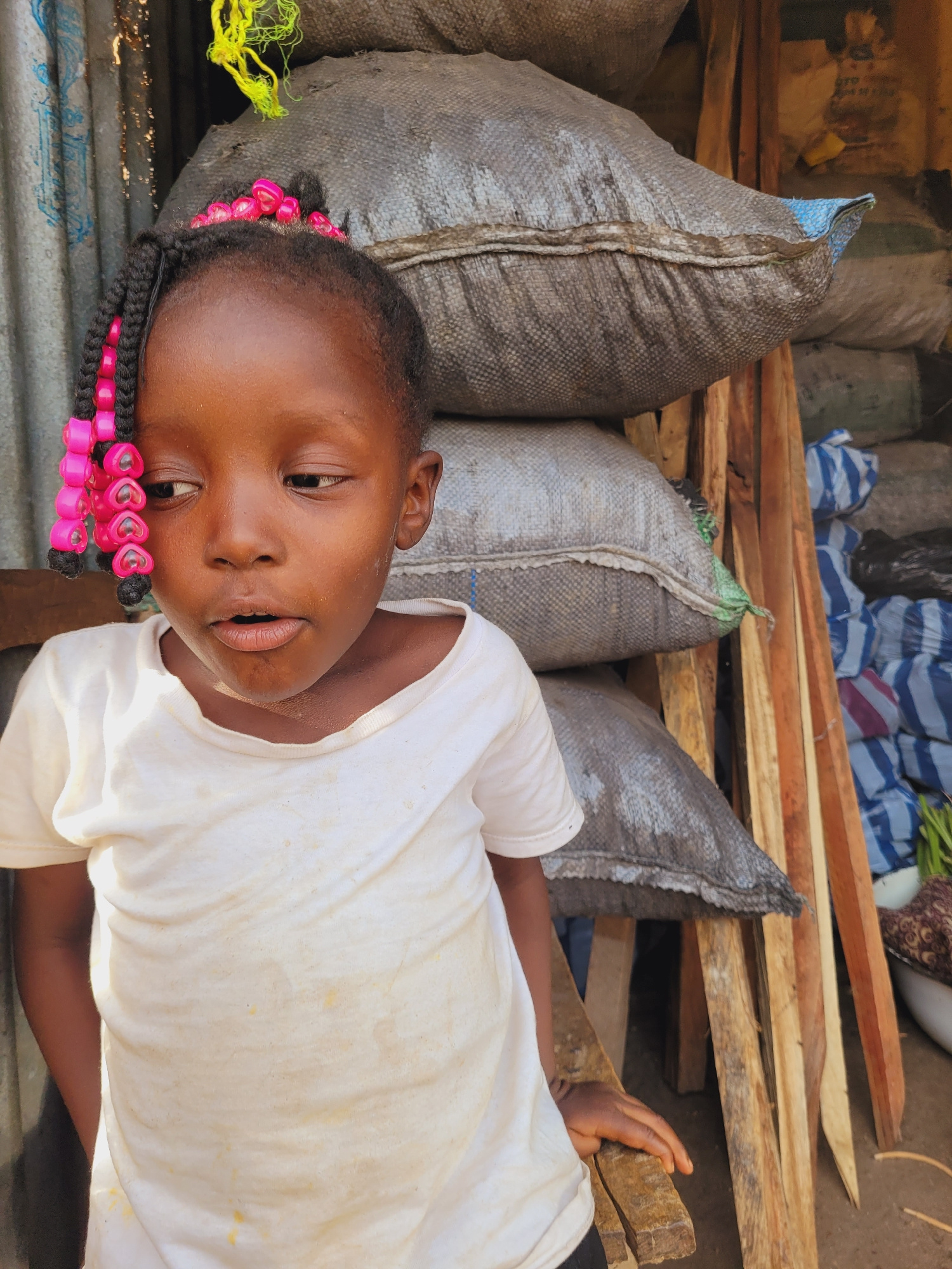 A young, dark-skinned child lies on corrugated metal next to several large, gray sacks in Bukuru, Nigeria. The child, who is wearing a white t-shirt and has braids adorned with pink heart-shaped beads, looks up towards the camera. Wooden planks and assorted bags are stacked in the background. The scene is outdoors and appears to be in a storage or market area. | Open Wire