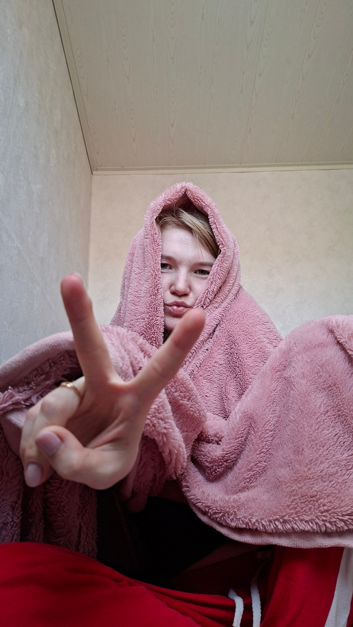 A young person, possibly female, with fair skin and light blonde hair, is facing the camera. They are wearing a fluffy, hooded, pink bathrobe or similar garment. They are holding their hand up, displa…read more