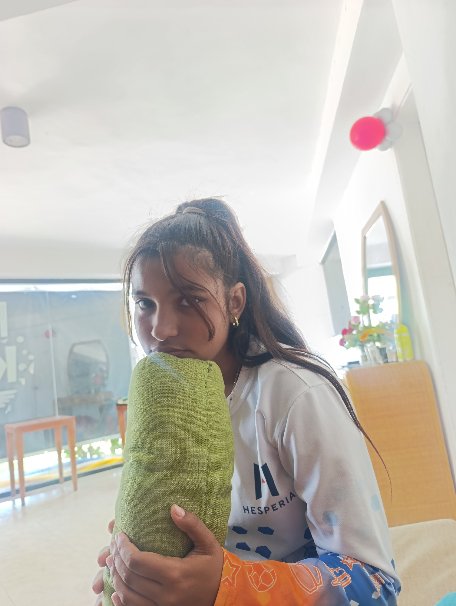 A young woman is indoors, holding a green bolster pillow. She is partially visible, with her face and upper torso in view. She has dark hair pulled back into a ponytail and is wearing small gold hoop…read more