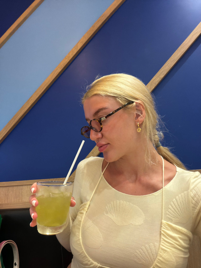 A young adult female is depicted in a close-up, seated within an establishment in Wichit, Thailand. She has blonde hair pulled back into a low ponytail and wears round, tortoiseshell-patterned eyeglas…read more