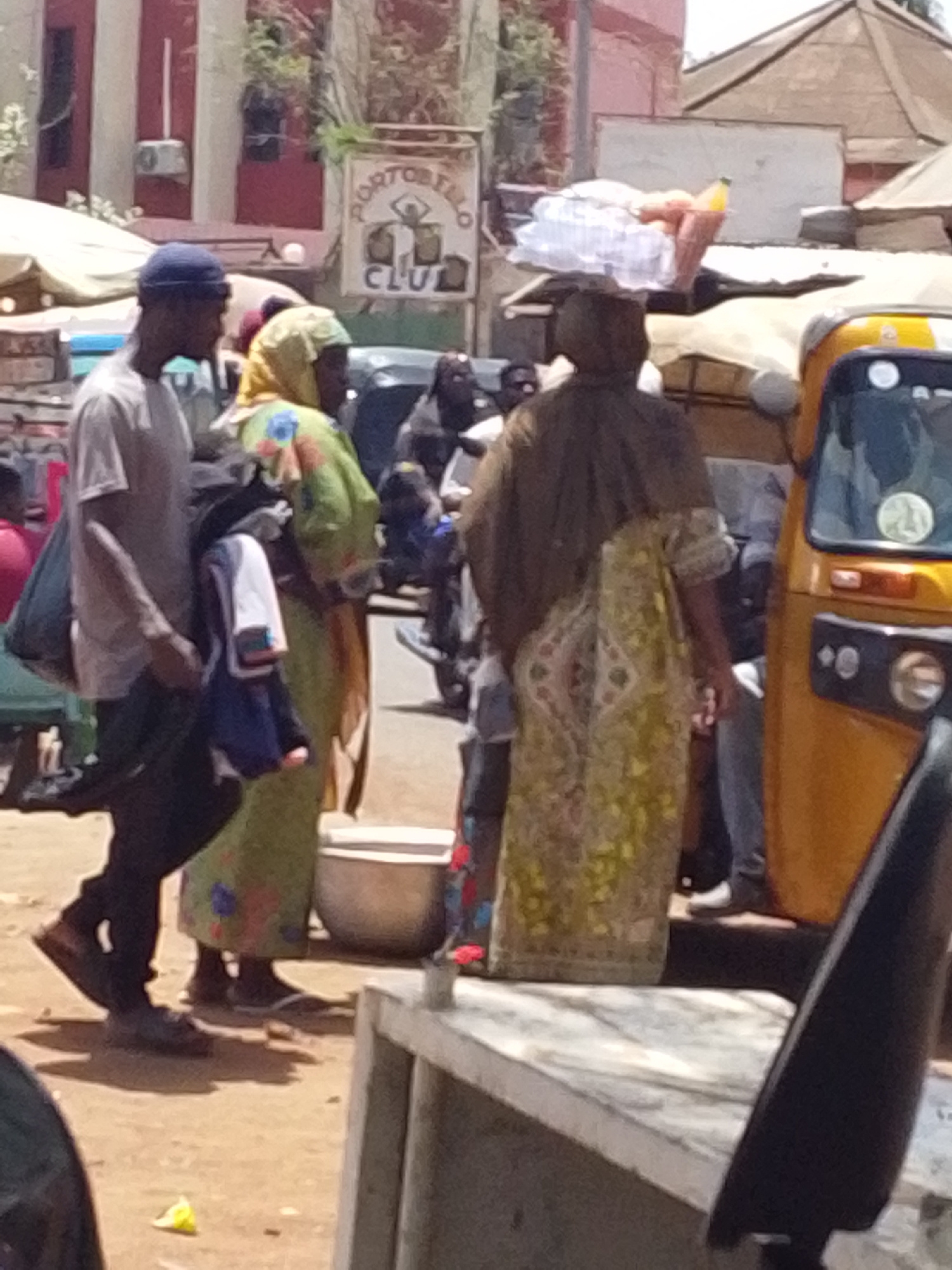 The image depicts a street scene in Tamale, Ghana. In the foreground, a man in a blue hat and grey shirt carries a bag and jacket. Next to him, a woman wears a patterned green and yellow dress and hea…read more