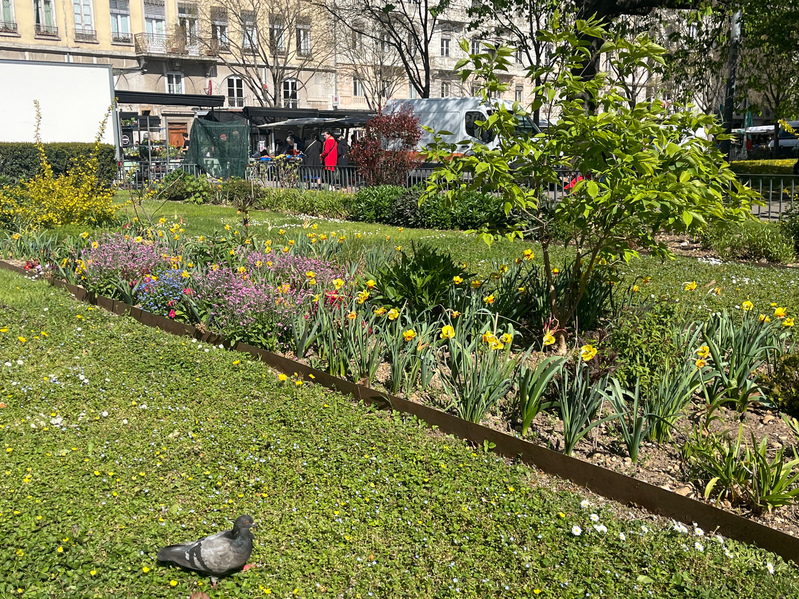 The image depicts a public park in Lyon, France. A flower bed, edged with a metal border, is filled with a variety of blooming plants, including yellow daffodils, pink, purple and blue flowers. The su…read more