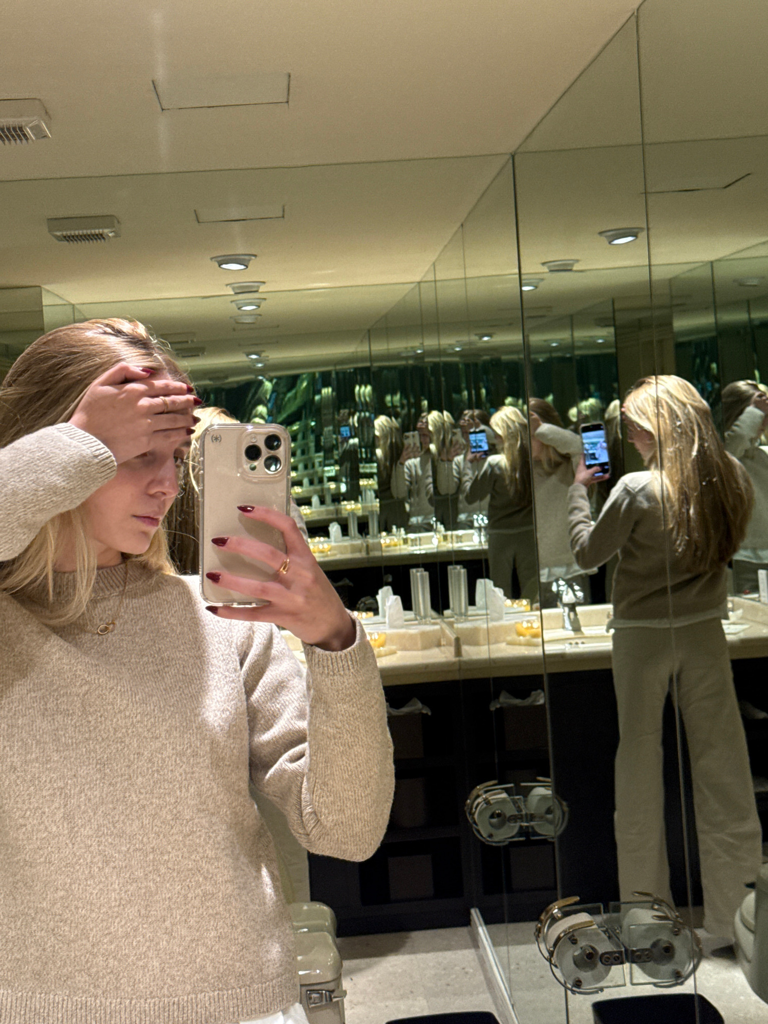A young woman takes a photo of herself in a mirror while in a bathroom, possibly in Mexico City, Mexico. She is wearing a light-colored sweater. Her face is partially obscured by her hand. In the back…read more
