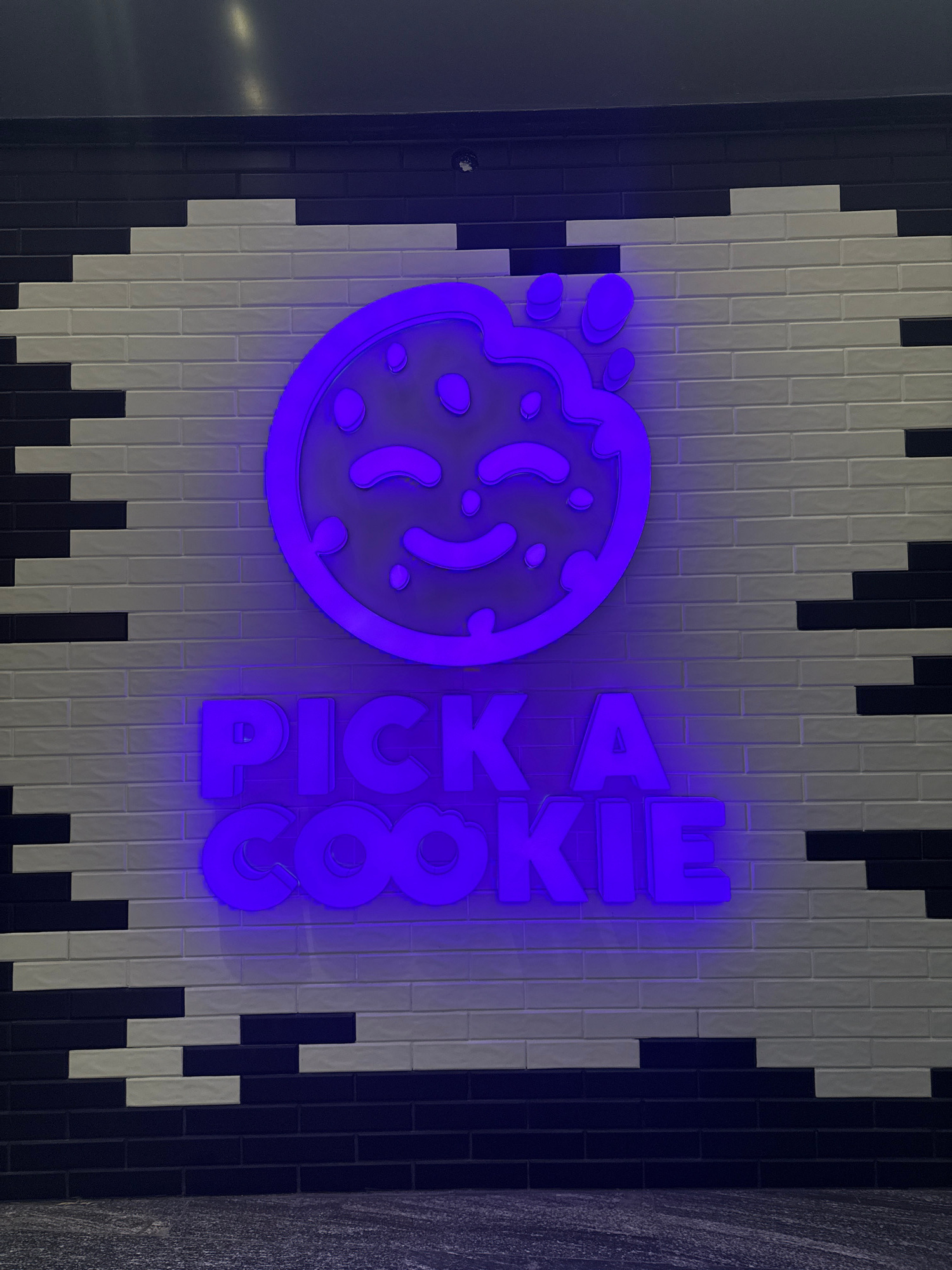 A vertical, close-up shot depicts a "PICK A COOKIE" illuminated sign on a textured wall. The sign features a cookie graphic to the left and the text "PICK A COOKIE" in a stacked arrangement to the rig…read more