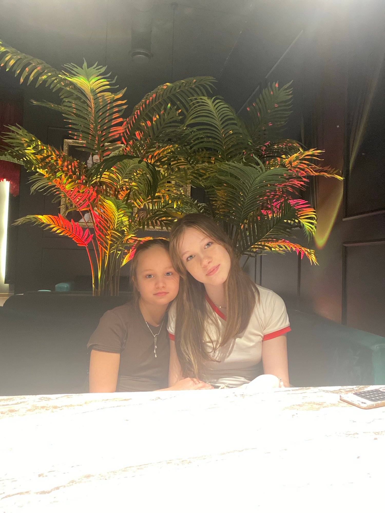 This portrait features two young girls posing in an indoor setting in Chaikovsky, Russia. The image is rotated 90 degrees counter-clockwise from its intended orientation. When viewed correctly, an old…read more
