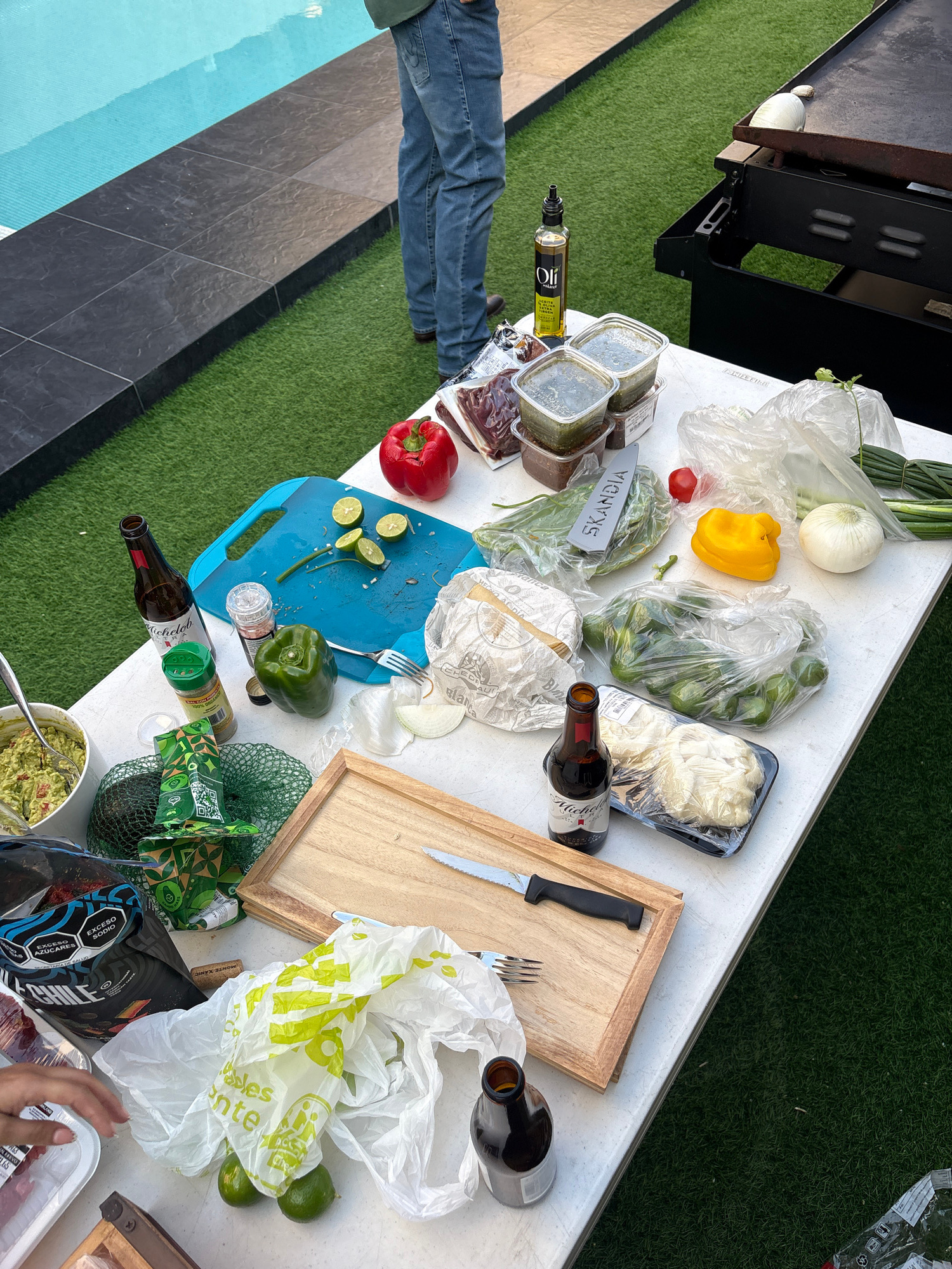 A high-angle shot reveals a white table cluttered with various food items and kitchen tools. Positioned at the table's edge near a grill, the scene unfolds next to artificial turf, a tiled area, and a…read more