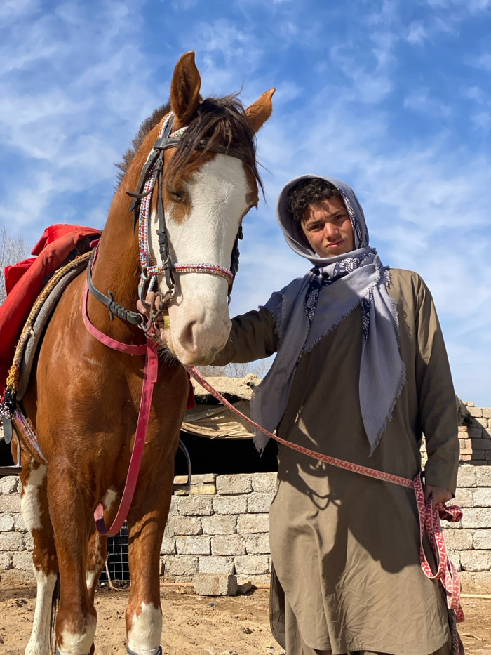 The image depicts a young male individual standing outdoors next to a horse in what appears to be a rural or semi-rural area of Kandahar, Afghanistan. **Subjects:** * **Person:** A male, approximat…read more