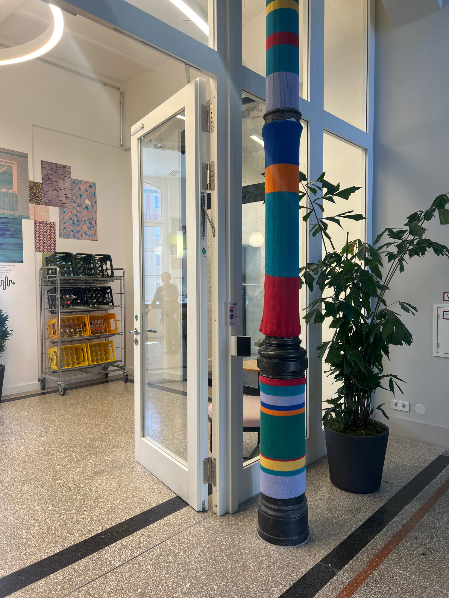 This image depicts an indoor scene, likely a hallway or communal area within a modern building, potentially in Berlin, Germany. The central feature is a large, horizontal pipe or beam, spanning the up…read more