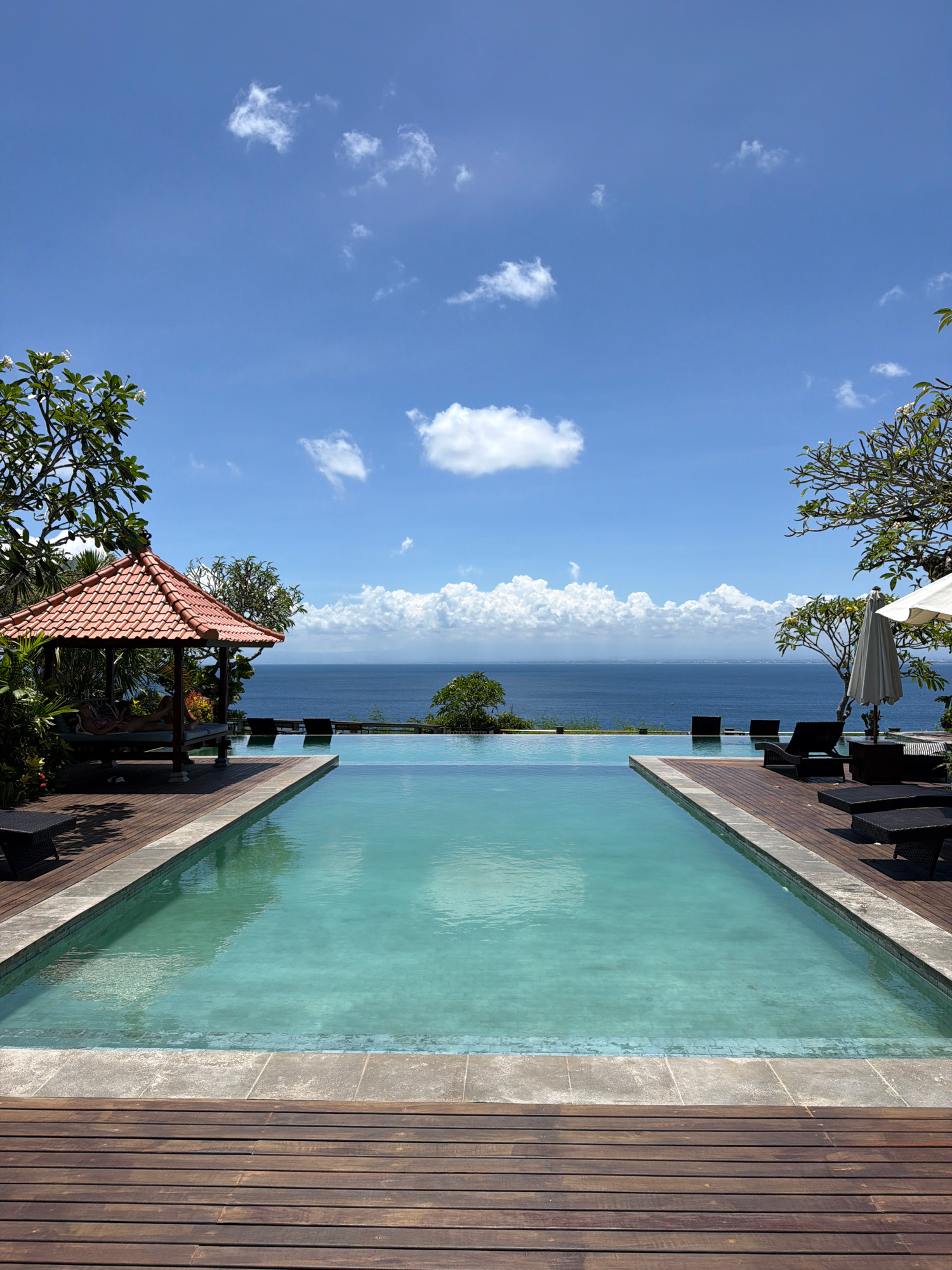 A daytime outdoor scene features a rectangular swimming pool with light blue water situated in a tropical location. The pool is bordered by dark brown wooden decking on both sides, with a strip of gre…read more