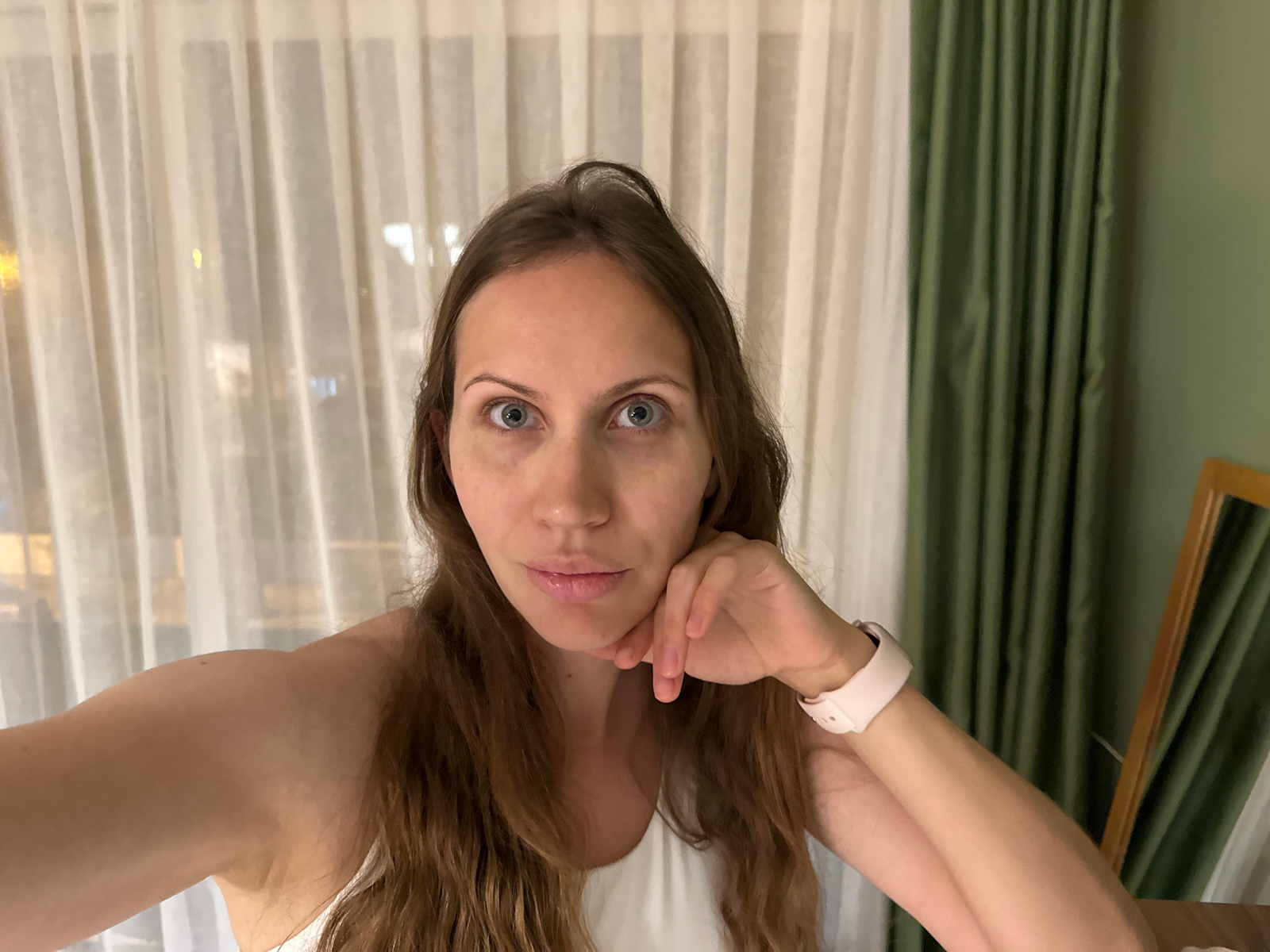 A woman with light skin, brown hair, and blue eyes is taking a selfie indoors. She is looking directly at the camera. Her right hand is resting on her face, and she is wearing a pink smartwatch on her…read more