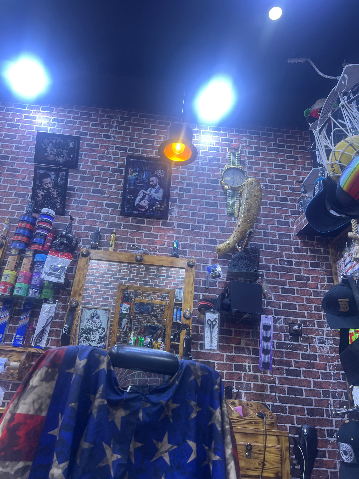The image shows the interior of a barbershop. The walls are decorated with red brick veneer and various items, including framed pictures, a clock, a decorative tusk, and barbering tools. A mirror with…read more