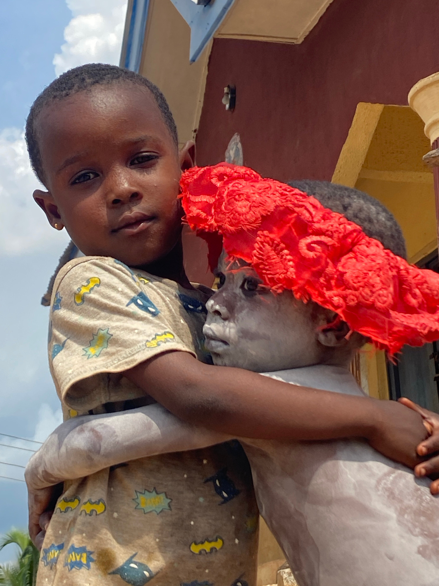 Two young Black children are hugging each other in Amoso, Nigeria. One child, facing the camera, wears a beige t-shirt with cartoon motifs. The other child, partly covered in white powder, has a red o…read more