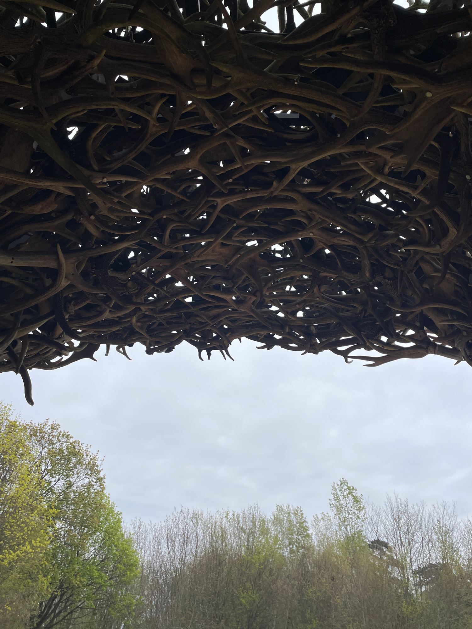 The image shows a structure in Keszthely, Hungary, made entirely of deer antlers. The structure is densely packed, creating a maze-like appearance. In the background, the sky is overcast and there are…read more
