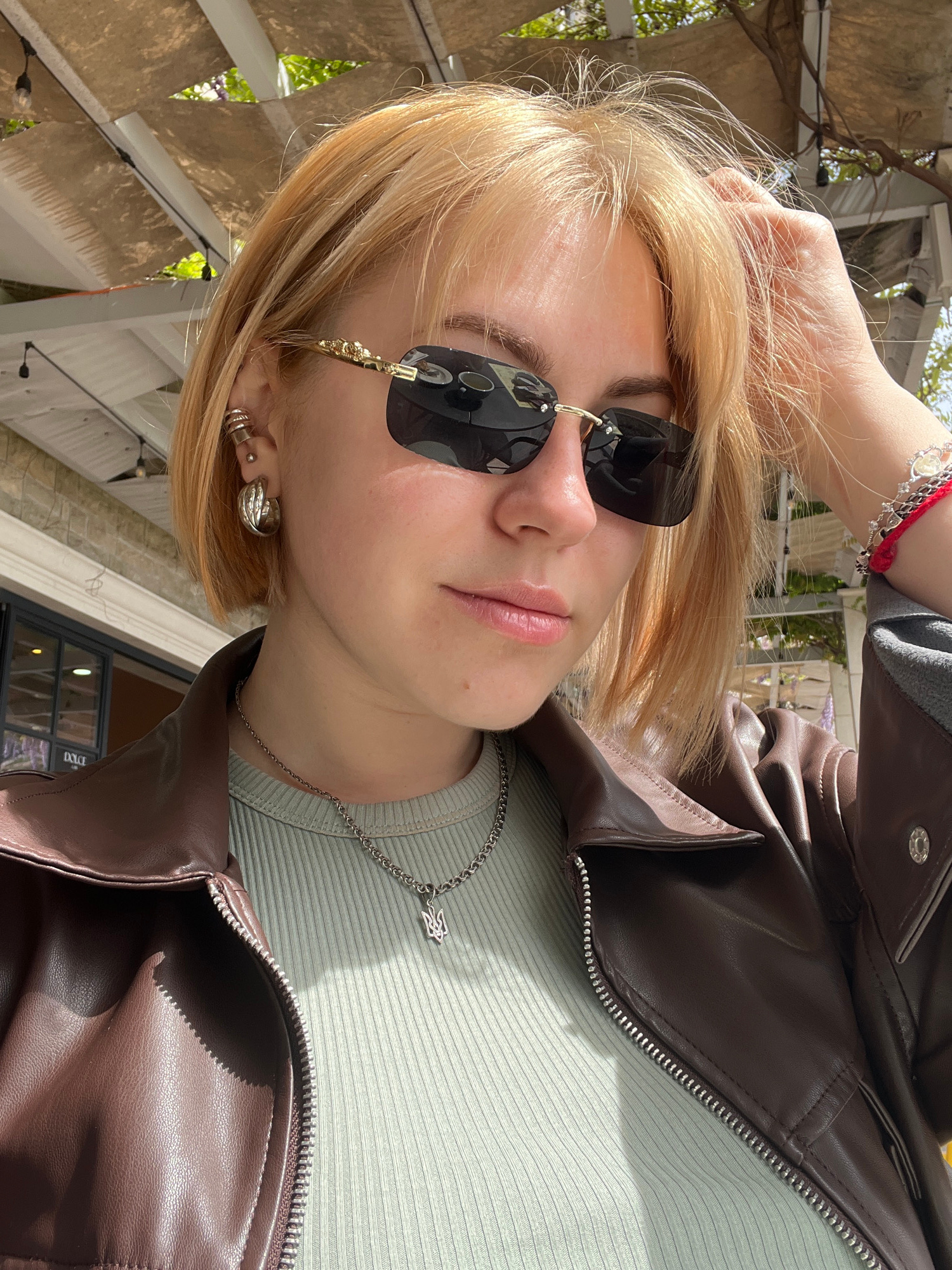 A young woman with blonde hair poses outdoors. She is wearing sunglasses, a brown leather jacket over a light green ribbed top, and jewelry including a silver necklace and earrings. She is holding her…read more