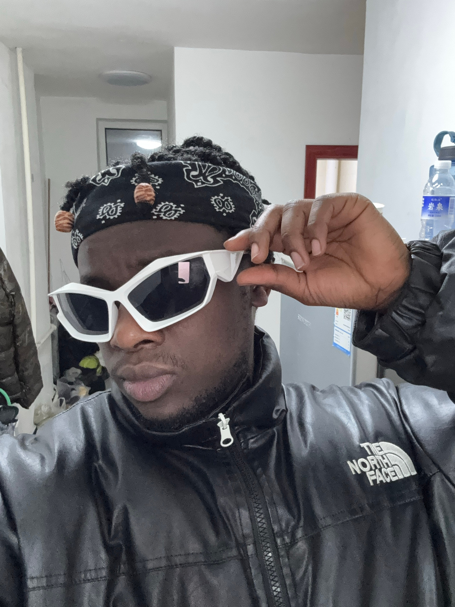 A person with dark skin is depicted indoors, wearing a black bandana with white patterns and decorative cylindrical beads. The person is also wearing white, angular sunglasses. A black, shiny jacket w…read more