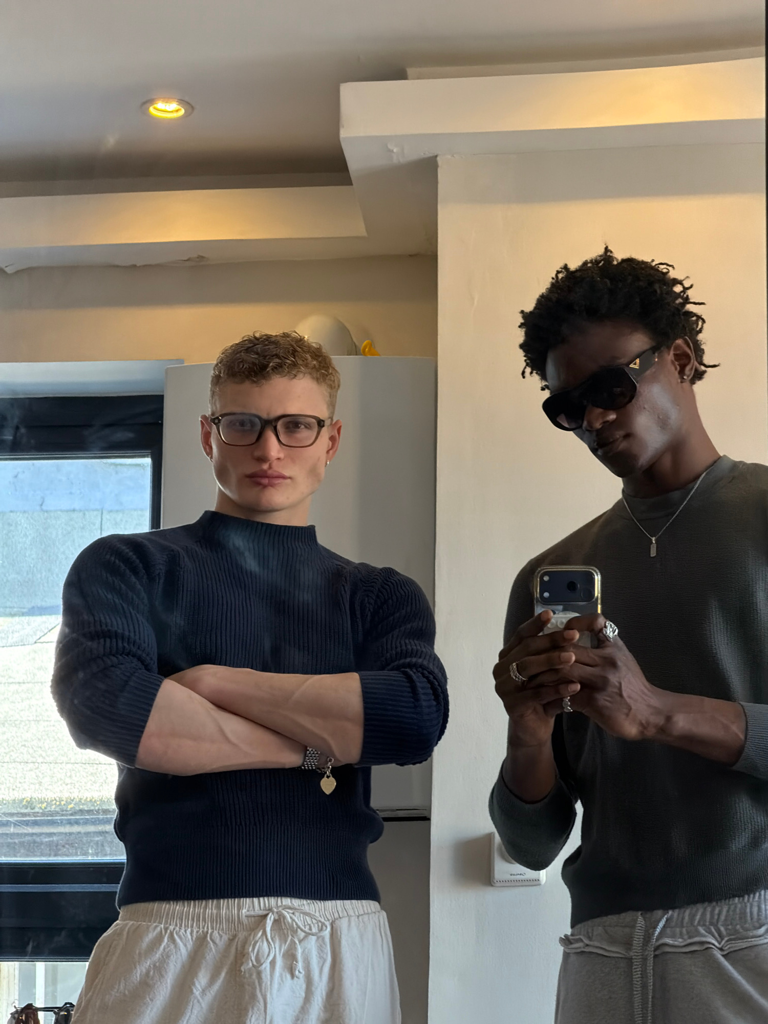The image shows two young men appearing to take a selfie in a room that may be an apartment or studio in London, United Kingdom. The top man is Black, wearing sunglasses, a grey top, grey sweatpants,…read more