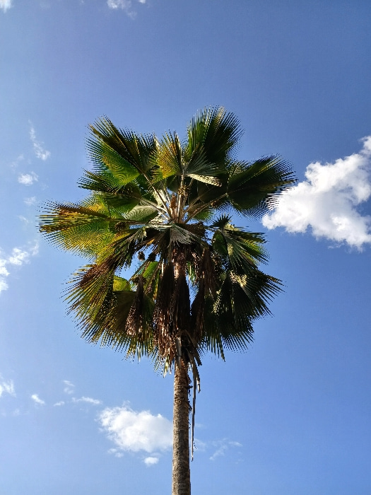A low-angle shot reveals a palm tree against a blue sky with scattered clouds. The tree's fan-shaped leaves display varying shades of green and brown, creating a vibrant yet slightly weathered appeara…read more