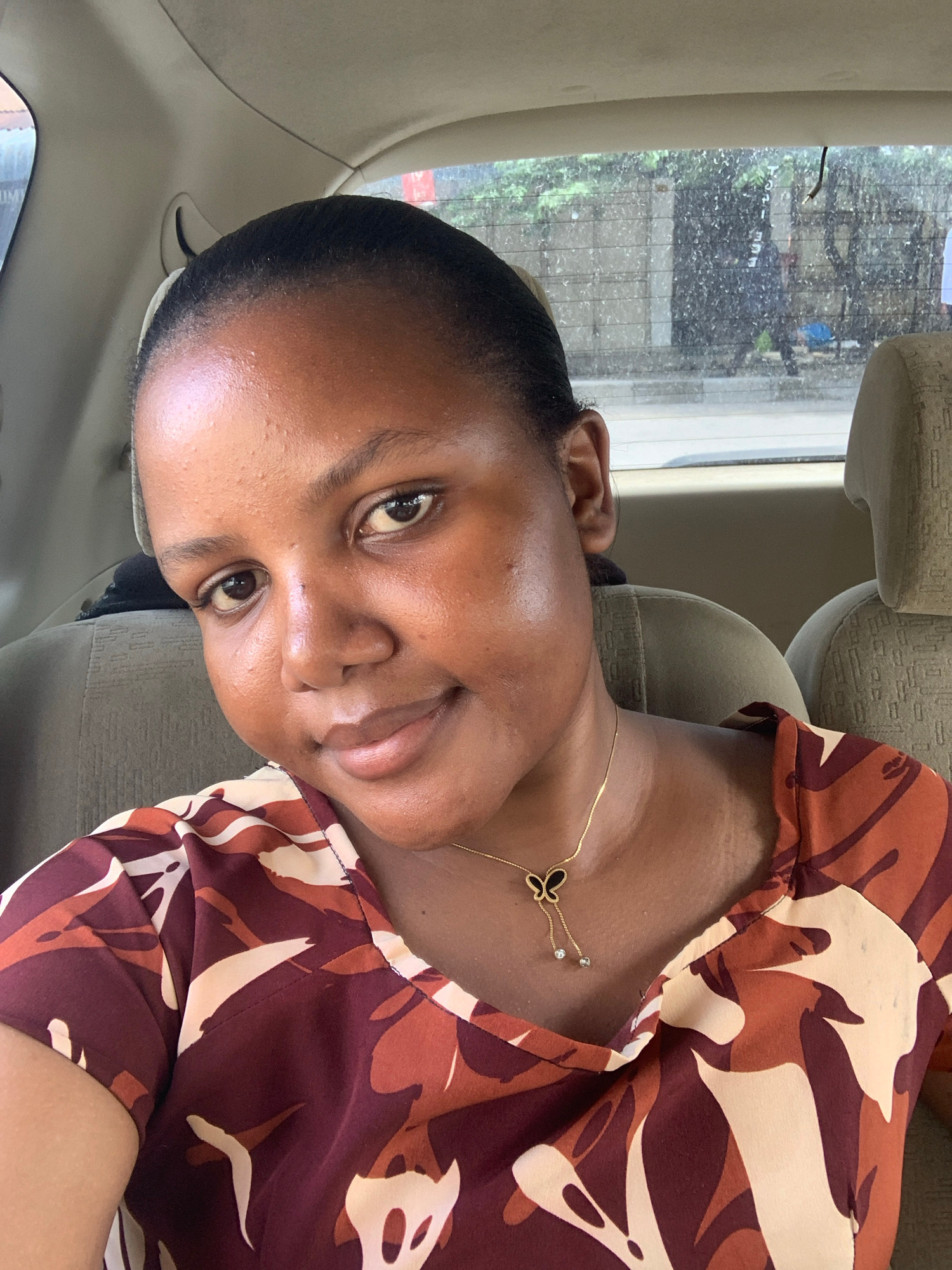A person with dark skin is positioned in a vehicle. The individual is wearing a brown and white patterned top and a gold necklace featuring a butterfly pendant. Outside the vehicle's window, one can d…read more