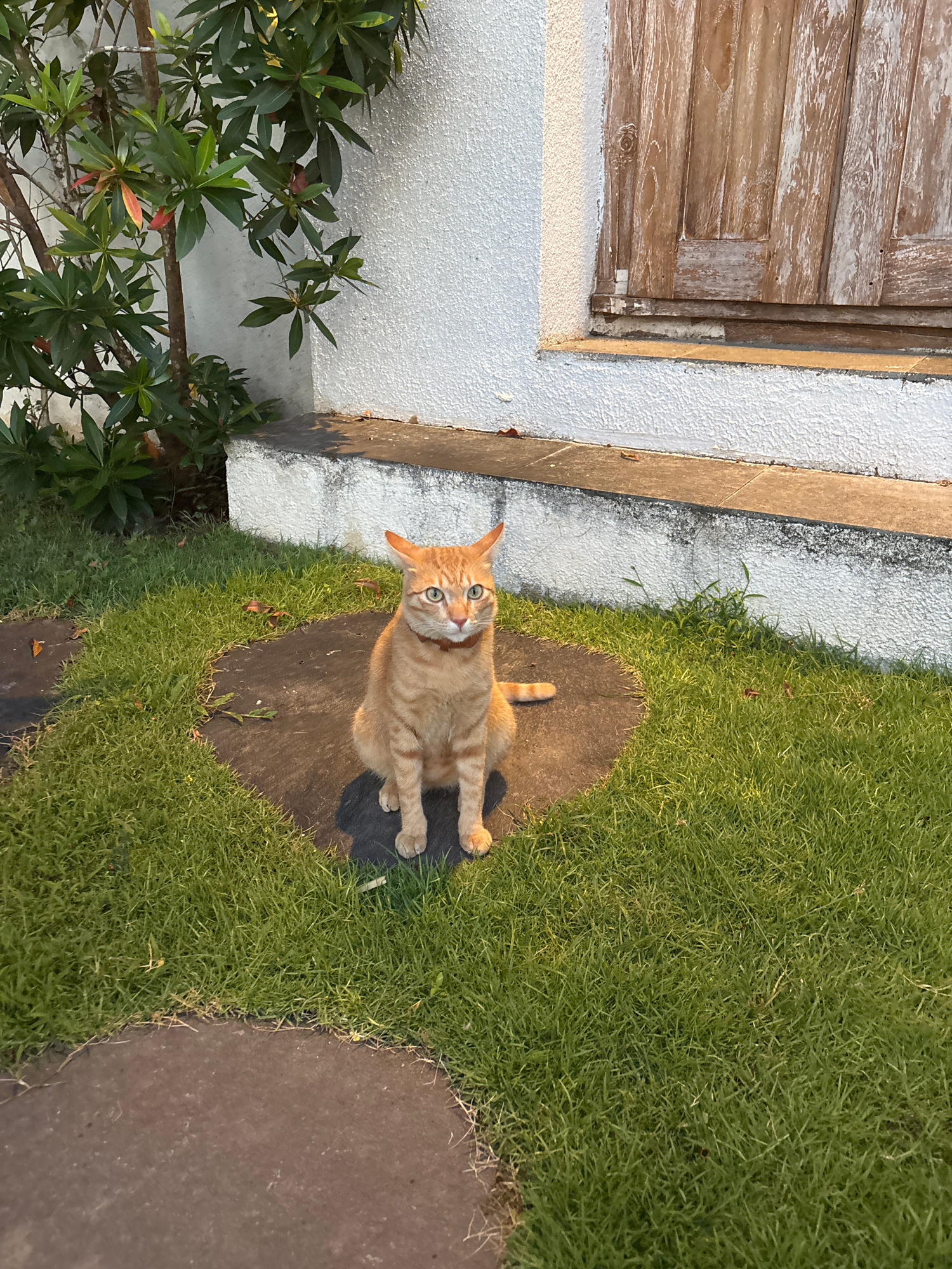 The image captures an outdoor scene, presented ninety degrees rotated to the left, featuring an orange tabby cat as its central subject. The cat, distinguished by its bright green eyes and a light bro…read more
