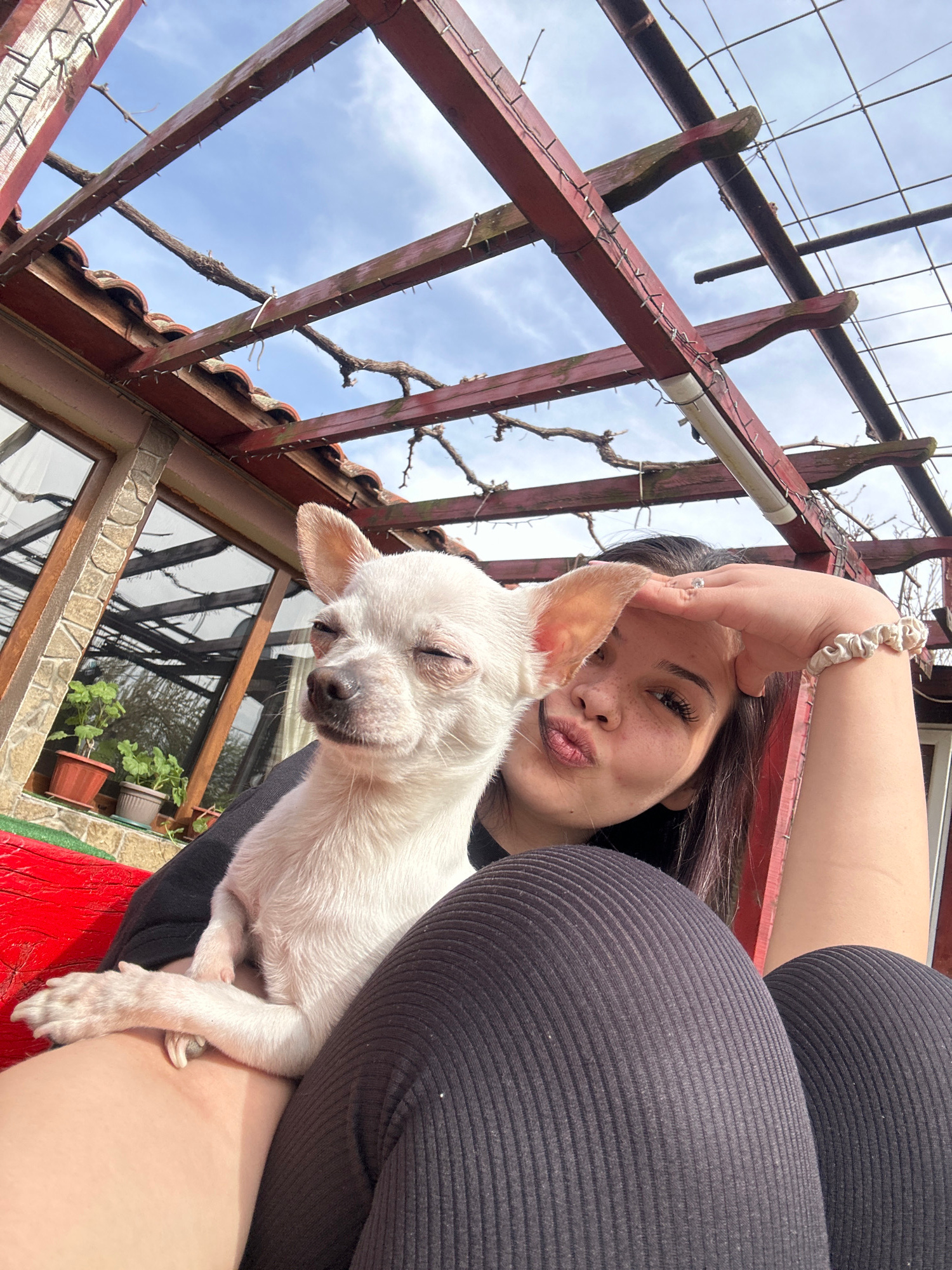 A low-angle selfie captures a young woman and a small white dog in an outdoor setting. The woman is visible from the chest up, with dark hair, a ring on her finger, and a light-colored scrunchie on he…read more