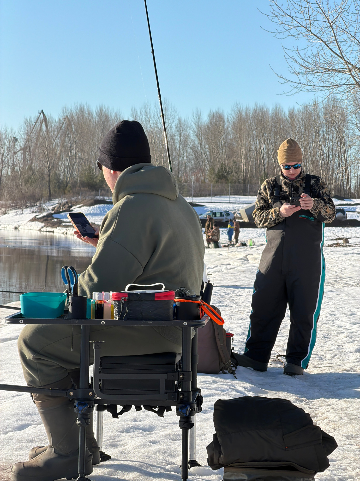 The image shows two individuals on a snowy terrain in what appears to be a rural setting. One person, wearing a khaki beanie, sunglasses, a camouflage jacket, and dark overalls with a turquoise stripe…read more