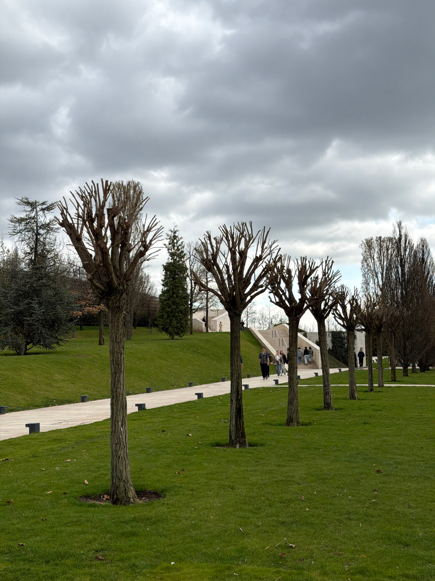 The image shows a row of pollarded trees in a park setting. The trees are bare, with only pruned branches visible. A strip of grass borders them. Parallel to the trees is a light-colored pathway with…read more
