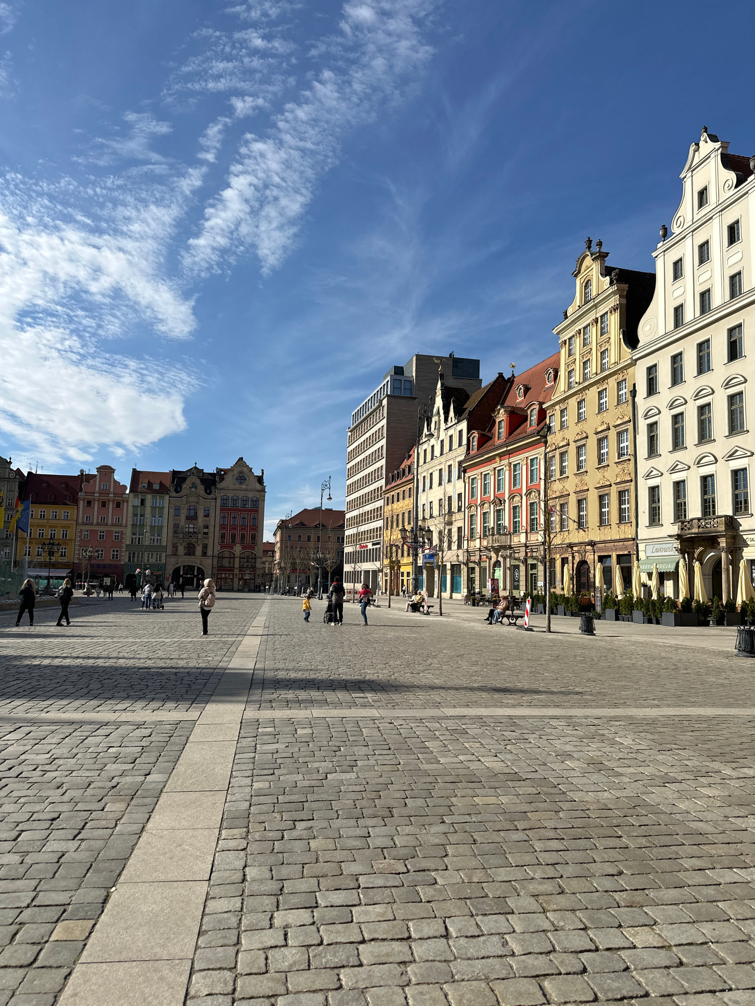 The image depicts a street scene in Wrocław, Poland. The perspective suggests the photo was taken at ground level looking lengthwise down a pedestrian square or street. Buildings with varying architec…read more