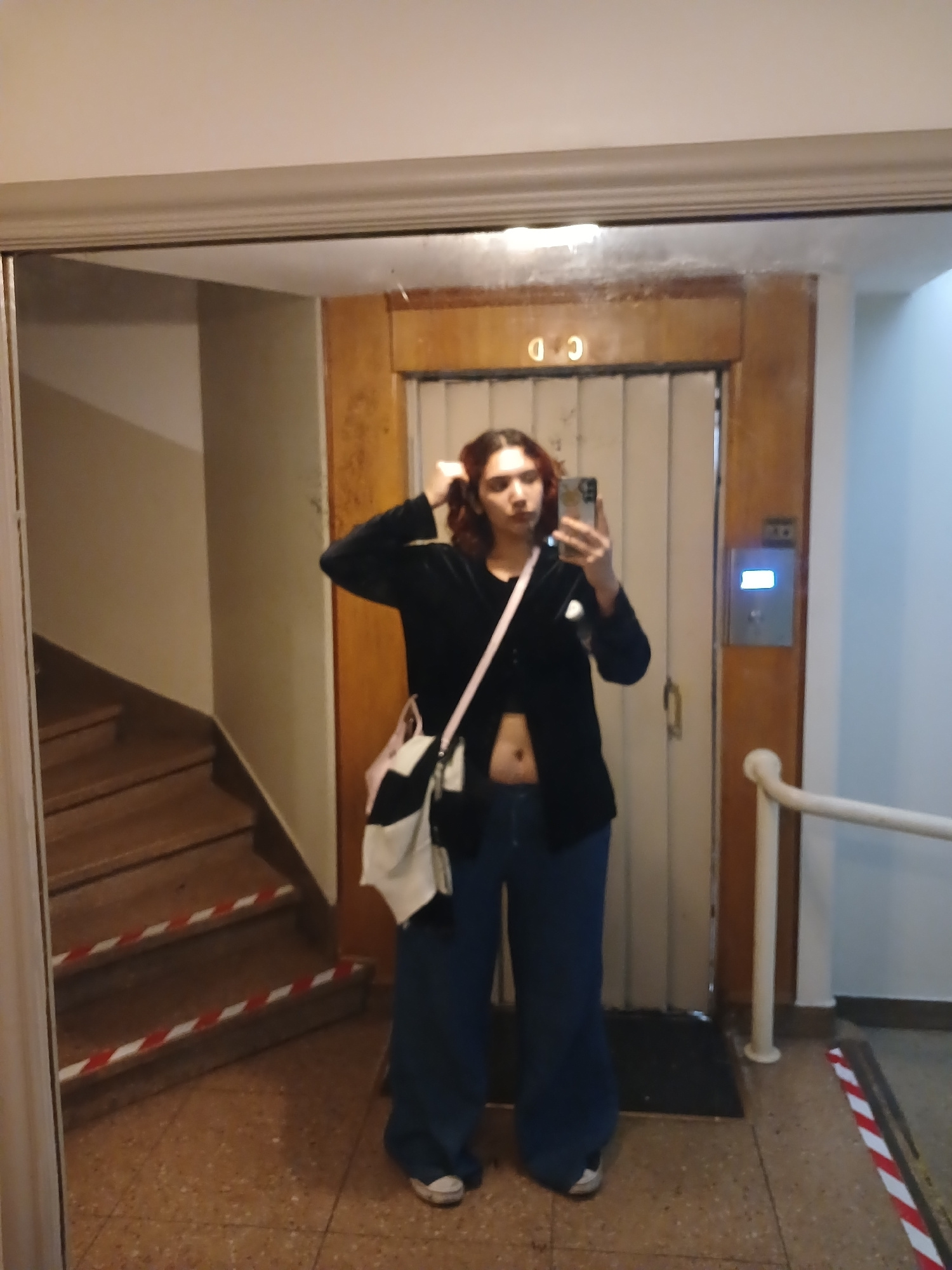 A mirror reflects a person with dark hair and a black top taking a selfie. The background shows an interior space with a wooden-paneled elevator door with an illuminated call button, a white handrail,…read more